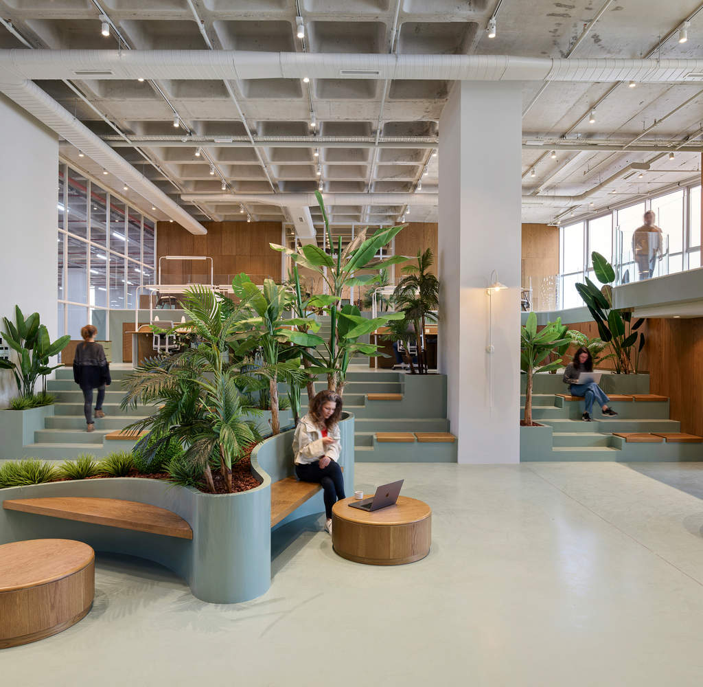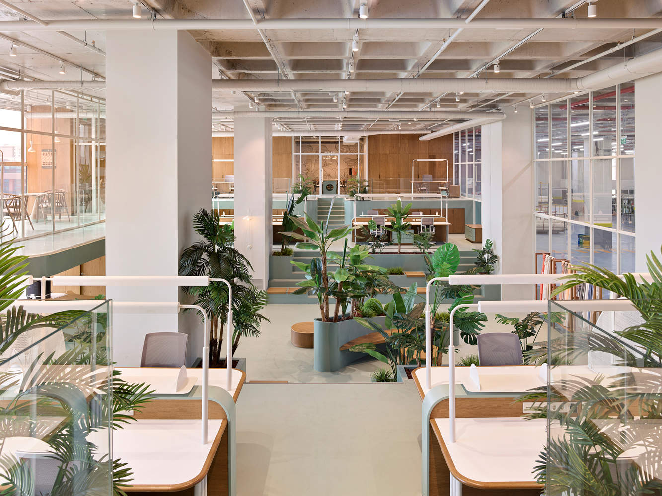 工作区——在工作区,Zemberek Design专注于各部门和生产区之间的功能关系。该设计是由自发互动和监督的需要驱动的,办公空间的设计允许与生产进行轻松的视觉和物理连接。这是通过折叠板结构实现的,该结构在不同级别为管理人员和团队领导创建了监控生产过程的平台。工作区和生产区之间的透明度有助于保持连续的视觉联系,使自然光从外部穿过广阔的内部立面,增强开放感。工作区的循环是流动的,路径汇聚到作为焦点的中央大厅。这些路线旨在促进互动,聚集区位于这些路径之间,以促进自发联系。建筑的钢结构覆盖着均匀的材料,与折叠的楼板相辅相成,创造了一种连续、有凝聚力的美学,促进了流畅的流通和对空间的清晰理解。