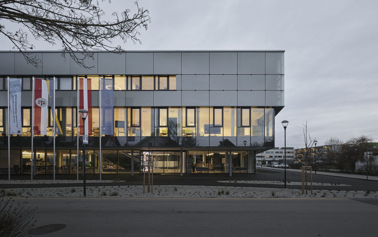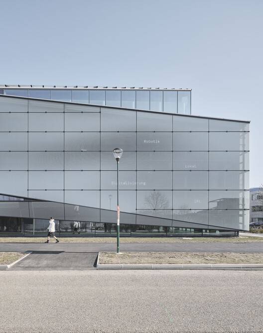 The mixed-use building features a showroom for digital technologies, start-up offices, a cafe, and auditoriums for the University of Applied Sciences Tulln. A multi-layered media facade communicates the topic of digitalization to its surroundings.