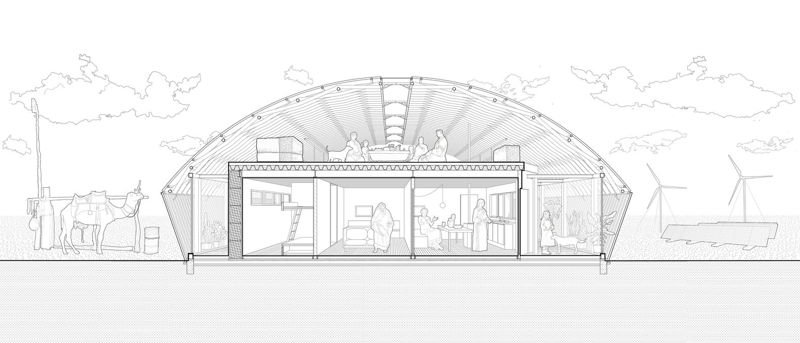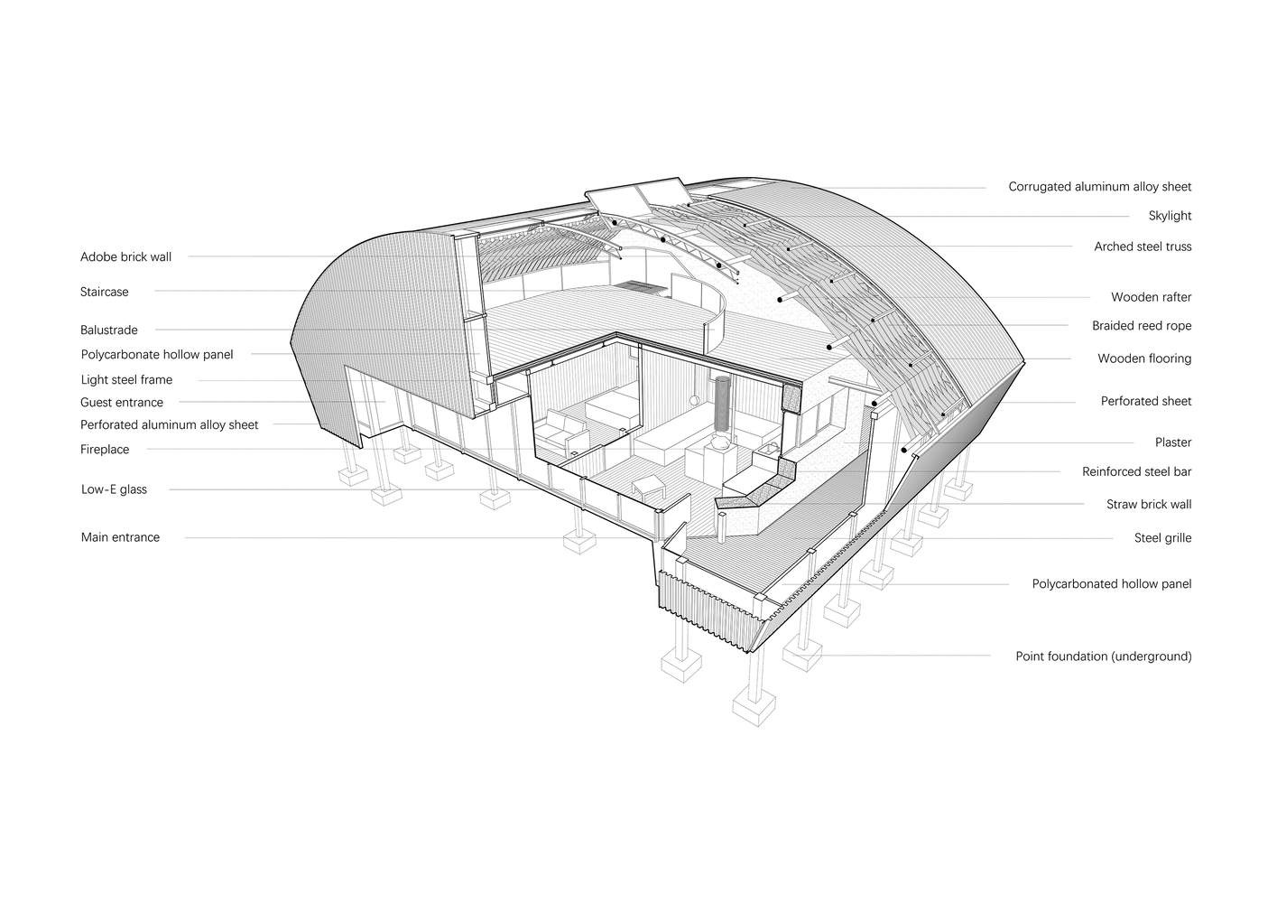 Straw Brick, Metal Shell - The project is a house for a herding family with the potential for tourism hospitality. The core area is constructed with straw bricks to meet the living needs of the family and guests. A breathable metal shell covers this core, providing space for festive gatherings and storage. While the metal shell represents mature industrial solutions, the straw bricks are directly derived from vernacular architecture in the region. The fusion of this lightness and heaviness forms our vision of an ideal desert shelter of the future.Herding and Living - The host and guests access their rooms through two corridors covered by the metal shell.