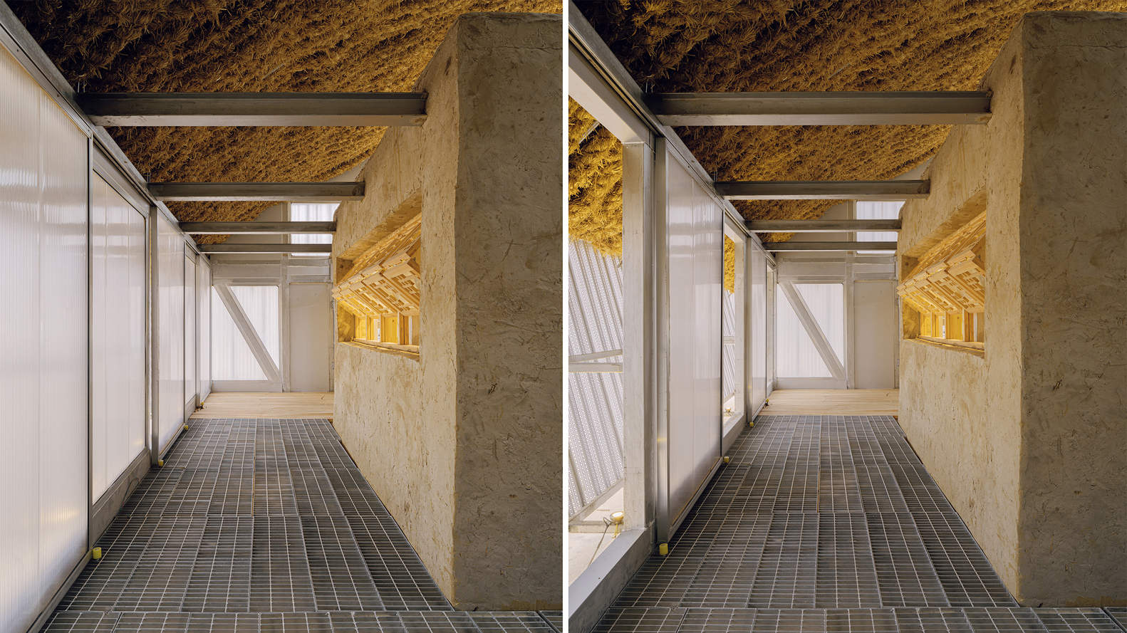 Adapting to the Season - The excellent thermal performance of the straw-brick wall and the climatic buffer zone enclosed by the metal shell ensure both a comfortable indoor climate and low energy consumption. In winter, heat is concentrated in the straw-brick section, while the climatic buffer zone minimizes heat loss to the outside. In summer, the breathable shell provides effective air circulation, keeping the interior cool and comfortable.