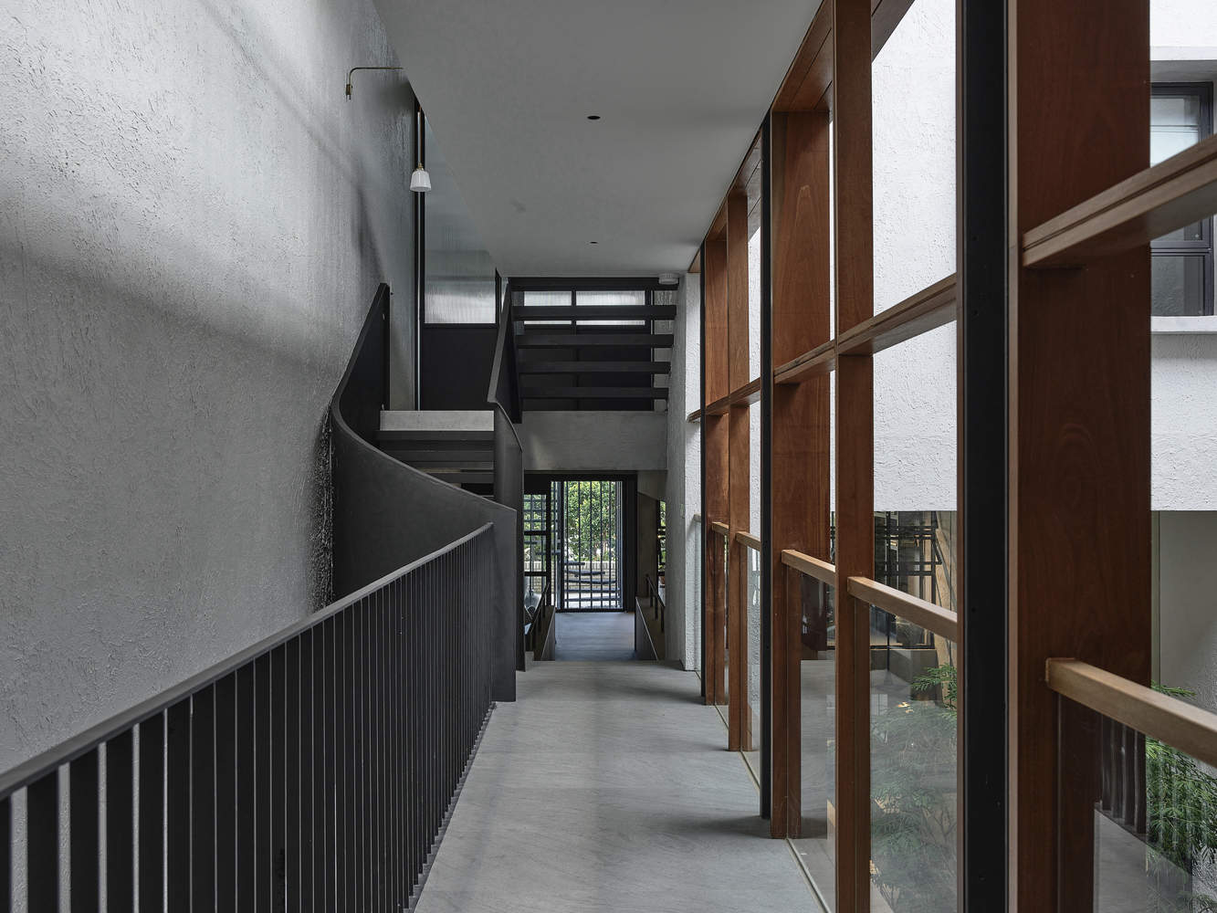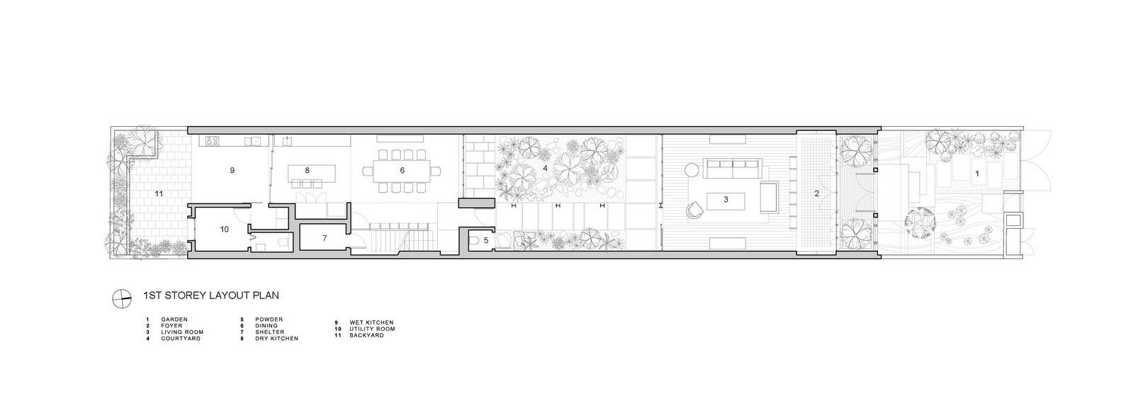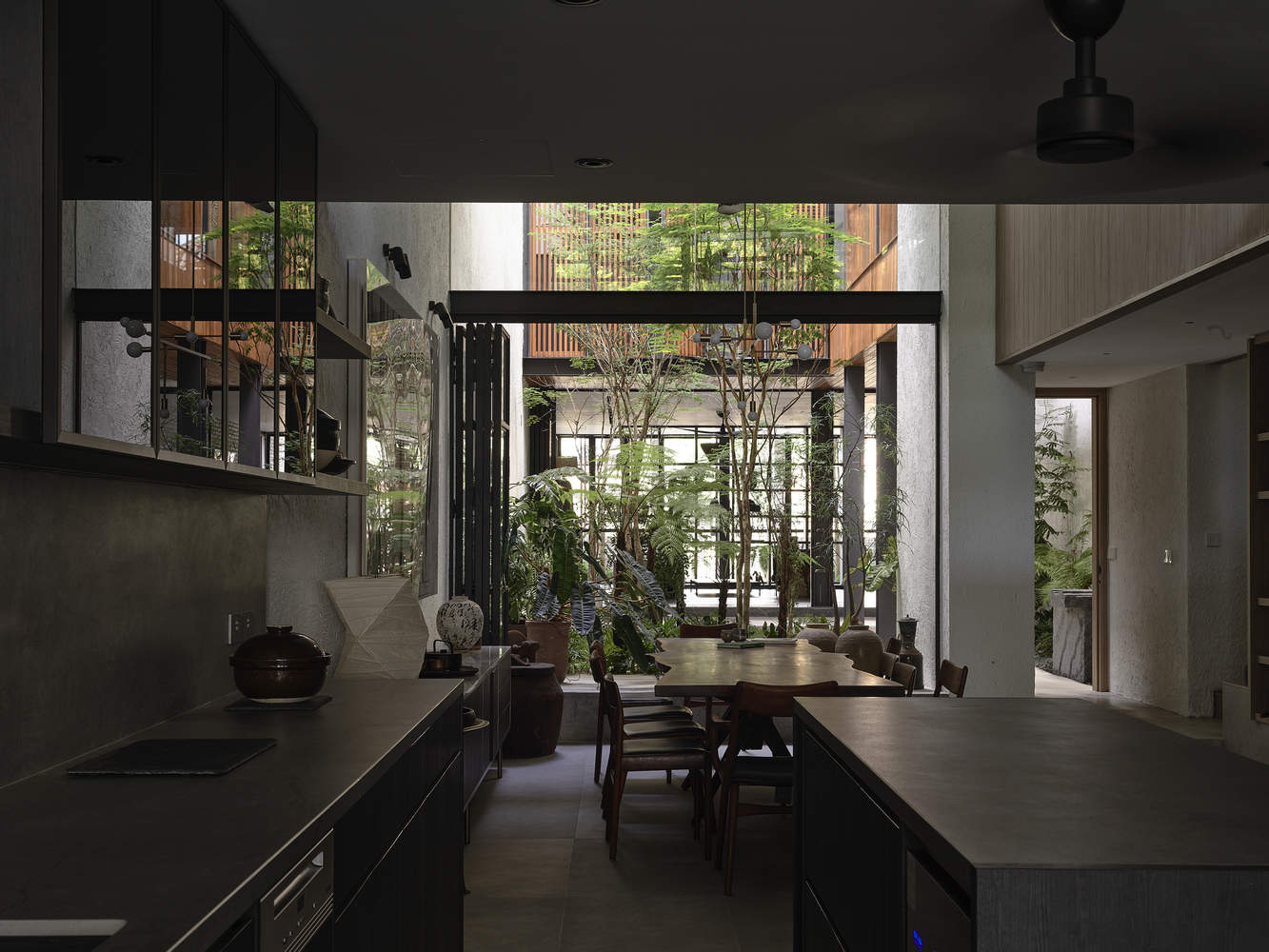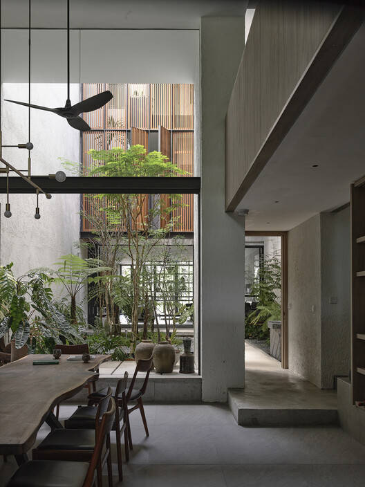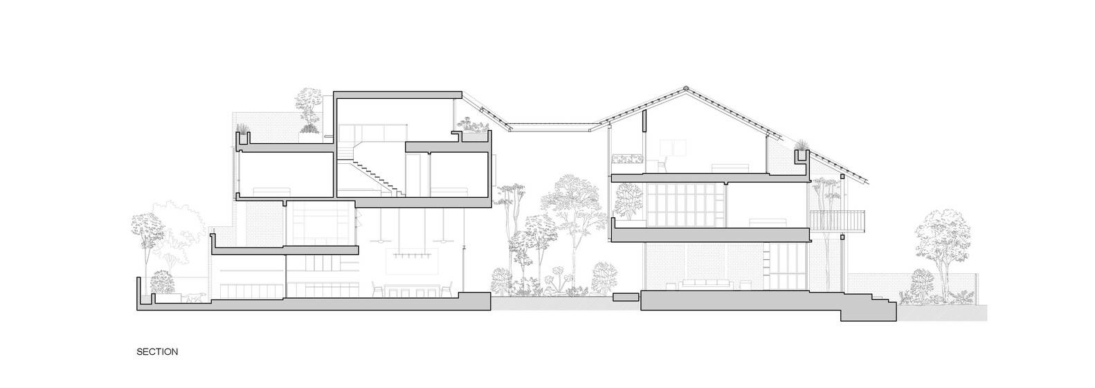 开放式庭院最终成为房屋的核心,欢迎阳光和雨水进入住宅的核心。庭院里精心规划了树木、灌木和垫脚石,以过滤强降雨。它还可以作为一个空气井,让房子在白天达到热舒适,特别是在新加坡的热带气候中。