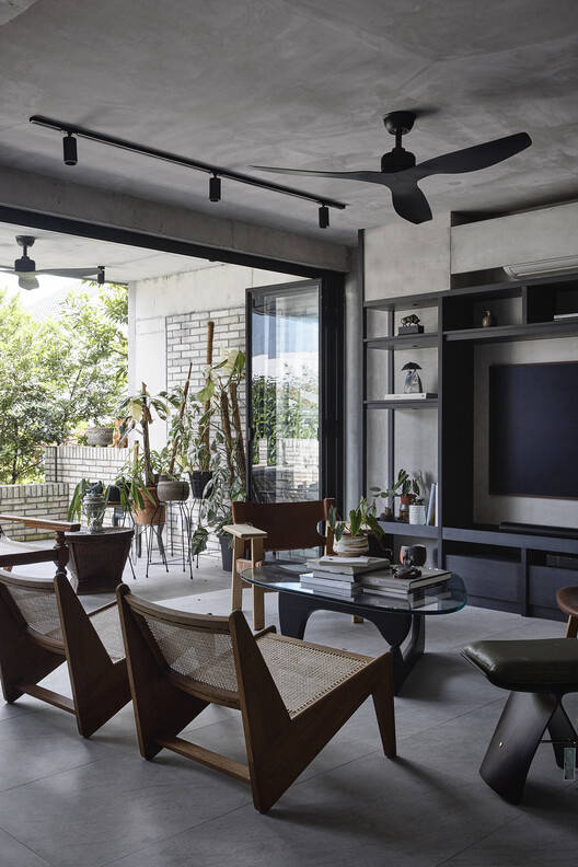店屋类型学的元素被抽象为最基本的形式,并重新组合成这个房子。房子的前部适应了店屋的对称性,每个角落都大胆地依偎着两棵豹树,透过狭窄的前立面向外窥视,保护房子免受天气影响,并提供隐私。从表面上看,客户对景观的热情也源于房子的设计,在房子的设计中,花盆沿着流通进行了战略性的规划。