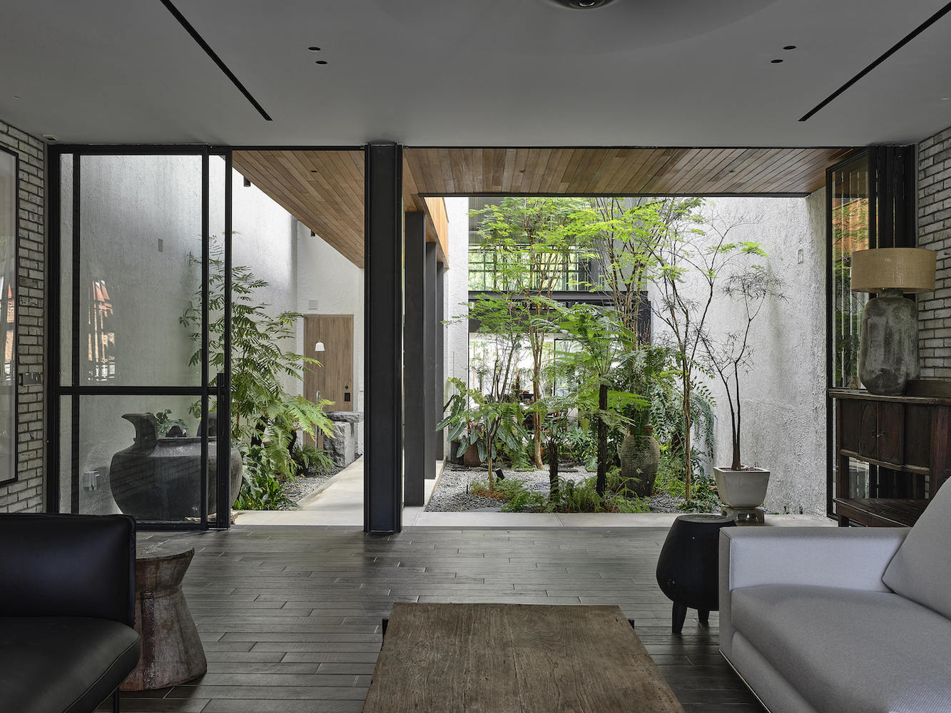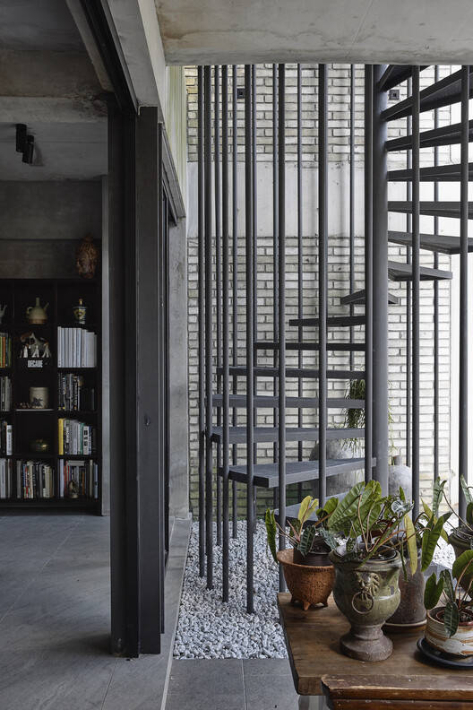 材料与侘寂美学的完美融合:该项目在材料的选择和运用上堪称典范,完美诠释了“侘寂”的美学理念。设计师从客户的艺术收藏,尤其是陶瓷和陶器中汲取灵感,选择了烟熏砖、混凝土和巴劳木材等材料。这些材料本身就蕴含着岁月的痕迹和自然的质感,经过时间的沉淀,更能展现出独一无二的魅力。材料的运用并非孤立的,而是与建筑的整体设计语言相协调。例如,烟熏砖的粗犷质感与混凝土的朴素风格相互映衬,营造出一种内敛而富有生命力的空间氛围。设计师还充分考虑到材料的耐久性,鼓励材料随着时间的推移而产生铜绿,从而赋予建筑更加丰富的内涵和个性,体现了对时间、自然和材料之间关系的深刻理解。