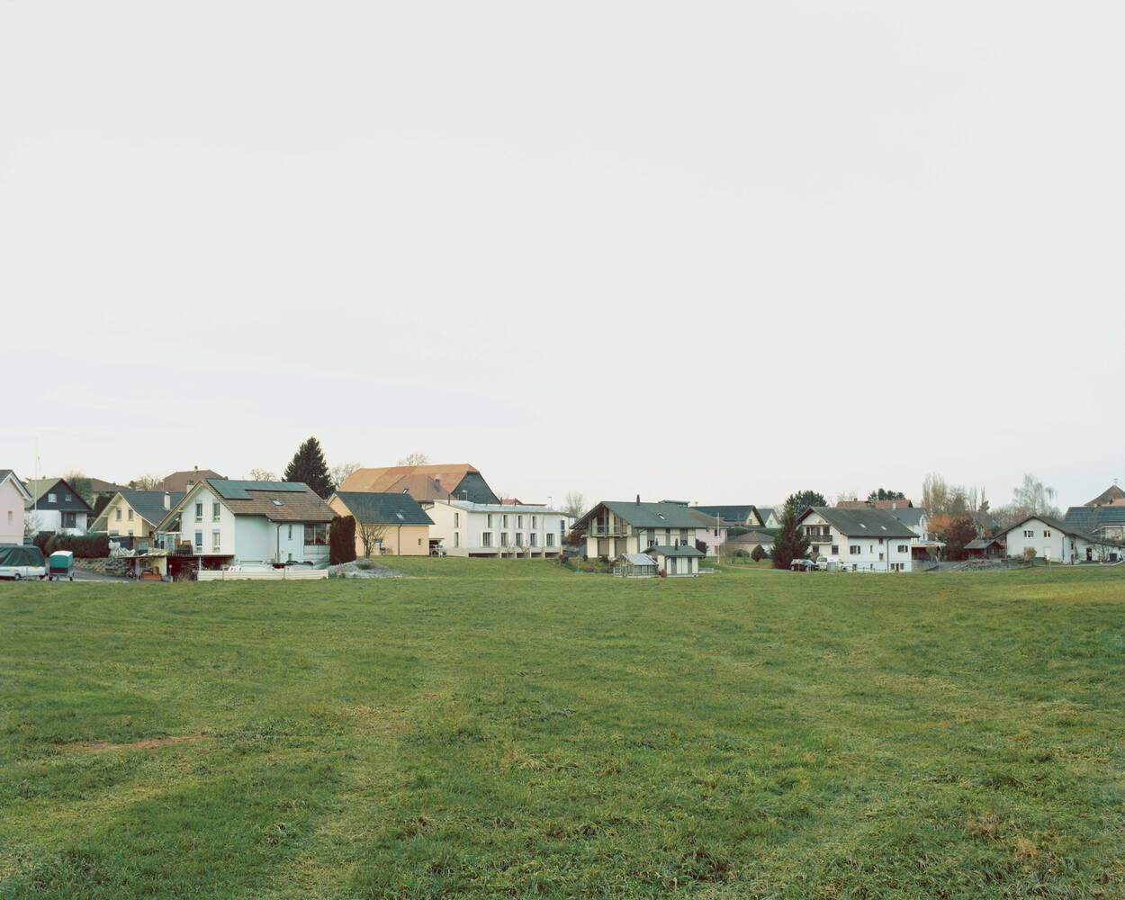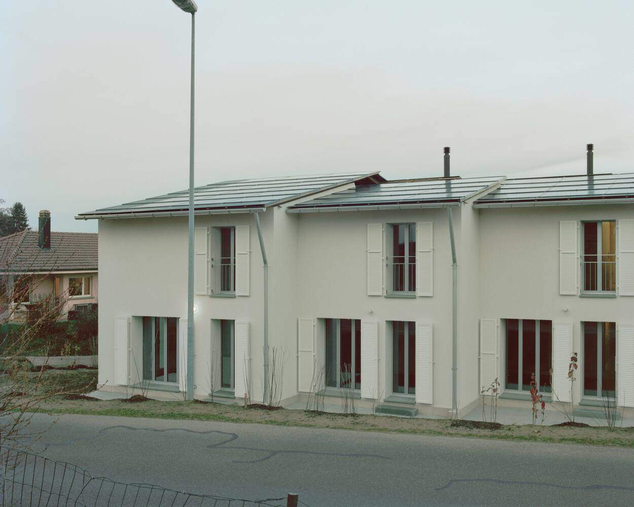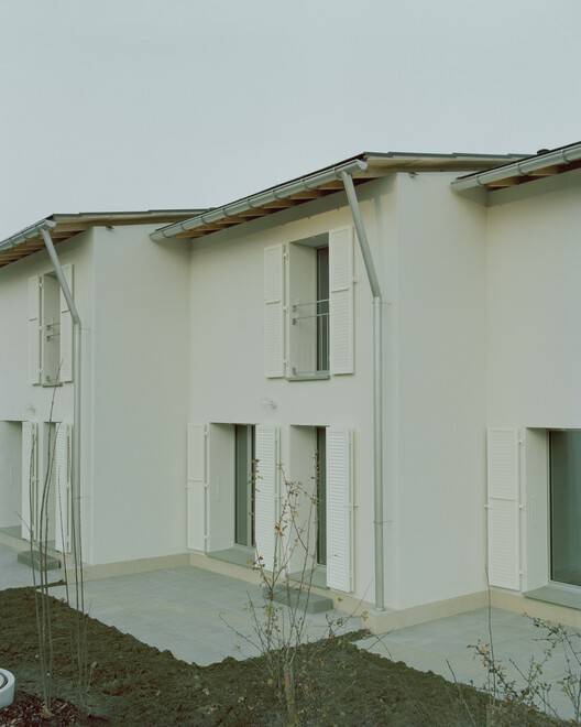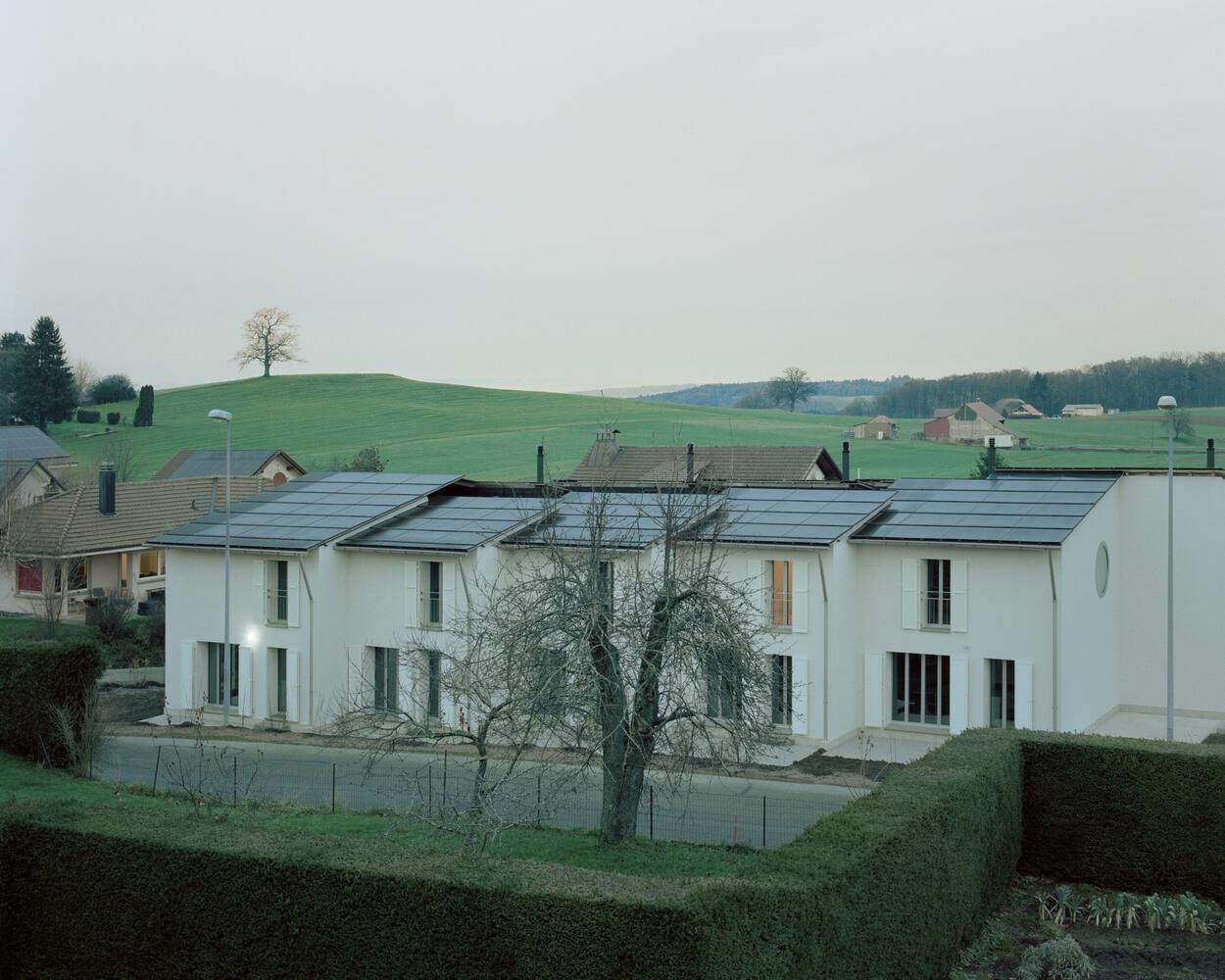Text description provided by the architects. This project of five villas in Villarsel-le-Gibloux is designed to integrate both into the site's topography and the existing built fabric, striking a balance between integration and architectural identity. The triangular plot guided the layout of the houses in a staggered arrangement, which helps to break down the volumes and create a more domestic scale. This composition provides a softer perception of the built form, ensuring that each home maintains its privacy while blending harmoniously into its surroundings.