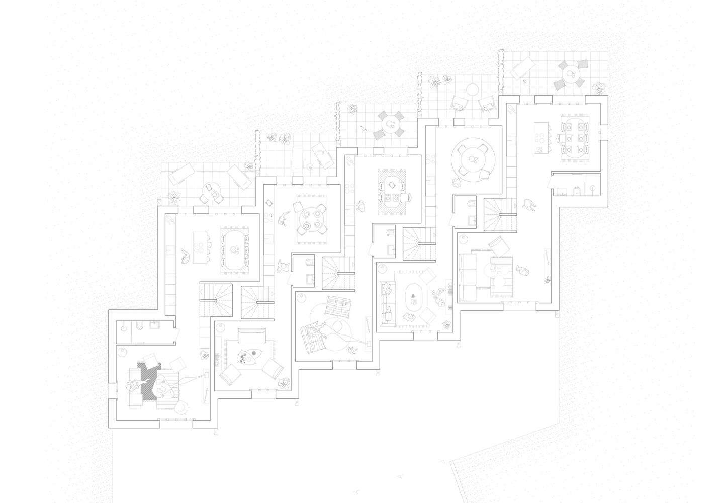 空间布局与功能性:该项目的空间布局和功能设计同样值得称赞。交错的布局不仅丰富了建筑外观的视觉层次,同时也为室内空间提供了多样的可能性。屋顶的设计,通过重叠的坡屋顶和中心平屋顶的结合,在满足功能需求的同时,也为建筑增添了韵律感。地面层主要生活区与花园的直接连通,创造了室内外空间的流畅过渡,提升了居住的舒适度。楼上卧室的设置,则充分利用了地势,保证了良好的视野。不同户型的设计,满足了不同居住者的需求,整个设计充分考虑了居住的舒适度、功能性和对自然的利用,体现了建筑师对人性化设计的深刻理解,以及对建筑空间的多样化可能性探索。