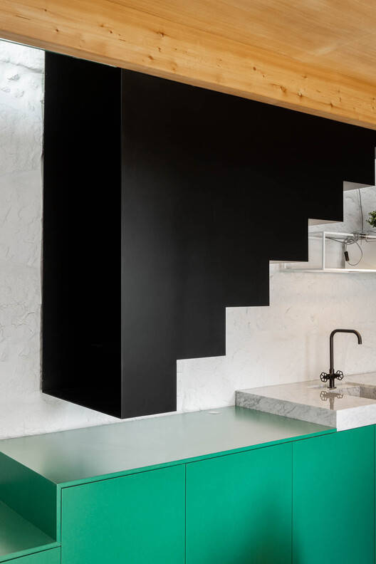 内外对比的视觉语言与空间利用:项目的精髓在于内外空间对比的巧妙运用。从外观来看,建筑师选择黑色的体量来突出入口,并以对比鲜明的百叶窗强调窗户的存在,这种设计语言赋予了老建筑全新的视觉形象。室内空间则以白色为主,通过镜面等材质的运用,最大程度地拓展了视觉空间,营造出通透、明亮、现代的居住氛围。尤其是贯穿两层的楼梯设计,不仅连接了上下空间,也成为视觉焦点,其起始于厨房、结束于卧室的设计,体现了对空间利用的极致追求。这种内外反差的设计,既保留了建筑的历史感,又注入了现代生活的活力,实现了历史与现代的完美融合。