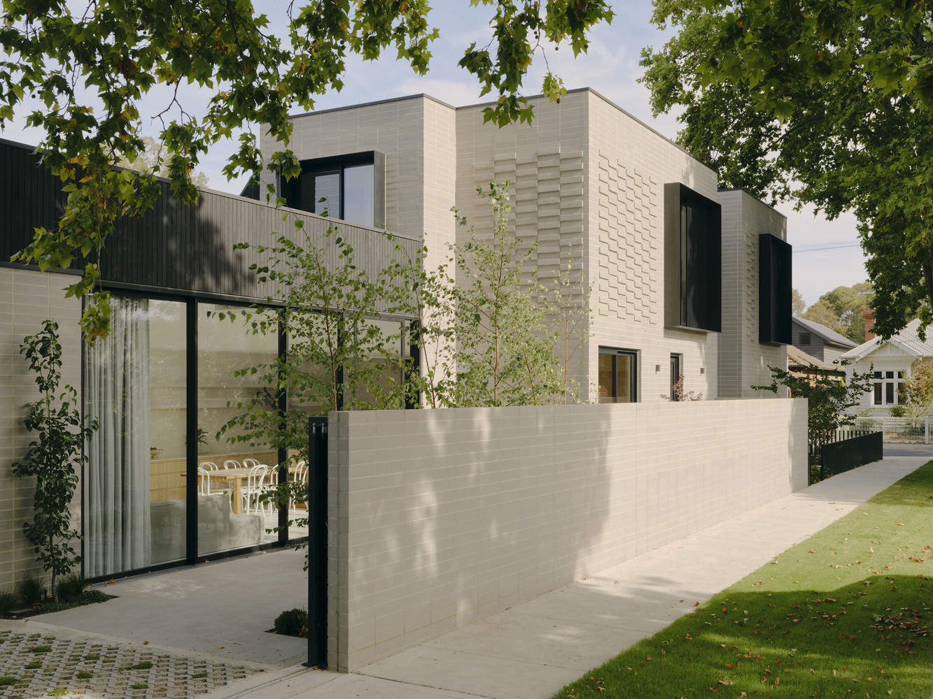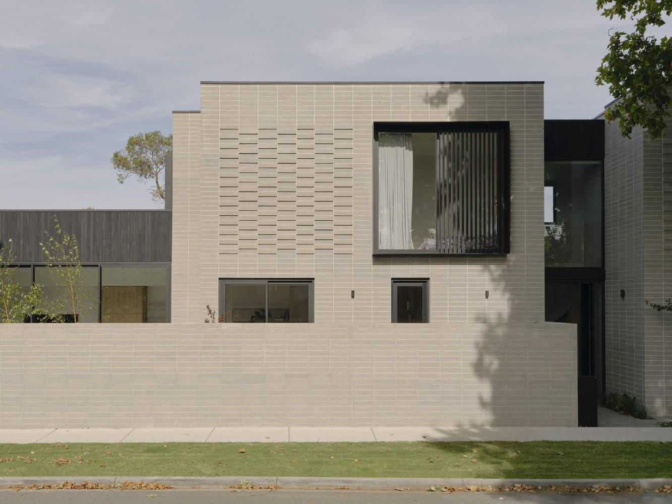 The project stands out due to its strong design presence despite its small size. It emphasizes simplicity and restraint, using robust materials to make a bold statement. The striking shapes are softened by mature trees and clever landscaping, blending seamlessly into the streetscape. The light-filled, modern home splits at the entrance, creating distinct zones for daily life and balancing privacy with togetherness. At 252m², the two-story house is grand yet understated, using modest materials in a modern, cohesive way to redefine the typical brick family home.