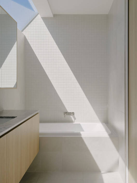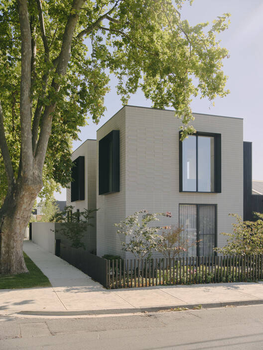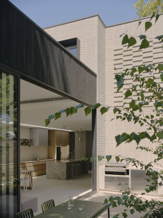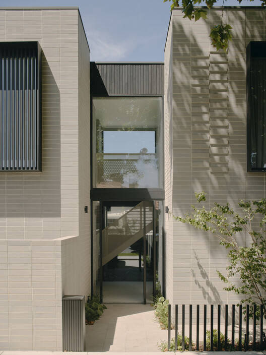Text description provided by the architects. Bonded House is a transformative reinterpretation of traditional materials, challenging the conventional aesthetic of a family home. Nestled on a snug corner block, the project showcases stacked brickwork forms bridged with a central light well, creating a striking visual and functional focal point. This architectural choice not only enhances the structure's aesthetic appeal but also maximizes natural light and ventilation, fostering a harmonious indoor-outdoor relationship. Landscaping plays a pivotal role in softening the pared-back design seamlessly integrating the structure with its natural surroundings.