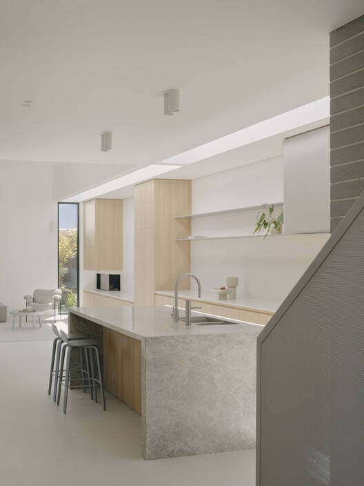 在内部,将砖块融入楼梯和厨房,并使用Artedomus瓷砖来呼应外部堆叠的图案,创造出一种有凝聚力的视觉效果。灰色、白色和温暖木材的柔软饰面使空间感觉通风和令人振奋。实现宏伟和明亮的感觉对房主来说至关重要。高高的天花板、超大的门、平静的材料调色板、带采光井的中央楼梯和精心布置的天窗都营造出一种广阔的氛围。平面图是为现代家庭生活而设计的。孩子们的卧室在楼上,有家庭浴室和第二个起居区。楼下包括公共生活空间、厨房、洗衣房、化妆室、灵活的办公室和一个分隔主卧的中央楼梯。这种布局会随着家庭的增长而调整,确保房子经得起未来的考验。