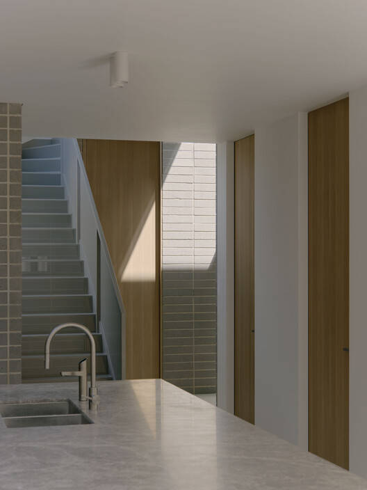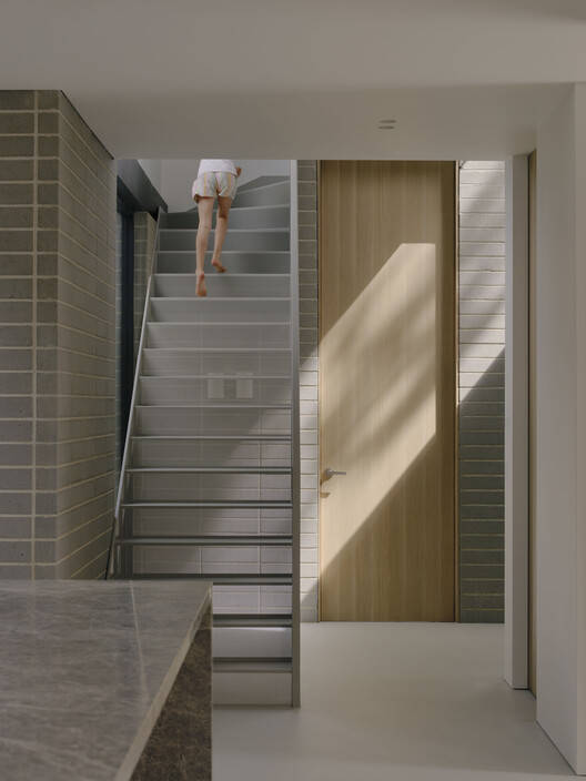 材料与形式的统一: “保税屋”最显著的特点在于其对砖材的极致运用。设计师将砖视为一种雕塑材料,仿佛从单一的体量中切割和塑造出空间。这种设计方法创造了建筑内外在的统一性和持久性,从外部堆叠的砖砌形式到内部楼梯和厨房的细节,都体现了这种连贯的设计语言。砖作为主要材料的运用,不仅赋予了建筑沉稳的质感,也与周围环境形成了和谐的视觉关系。这种对材料的深度理解和巧妙运用,是该项目的一大亮点,展现了设计师对材料的掌控力和设计理念的连贯性。