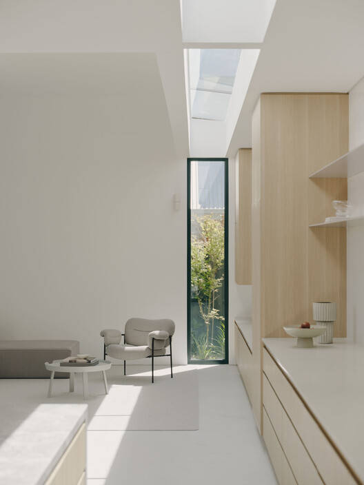 空间布局的灵活性与光线的巧妙运用: 在有限的场地条件下,设计师通过精心布局,最大化地利用了空间,并实现了不同功能区域之间的灵活转换。中央采光井是该项目的核心设计元素,它不仅是建筑的视觉焦点,更重要的是,它将自然光引入室内,创造了通透、明亮的空间氛围。建筑内部的楼梯、以及与上层的连接,都被巧妙地设计成雕塑般的特征,成为了重要的采光来源。设计师还通过穿孔的金属栏杆,使得光线能够自由穿梭,同时将室外的景致引入室内,从而营造了室内外空间的互动关系,增强了居住体验。