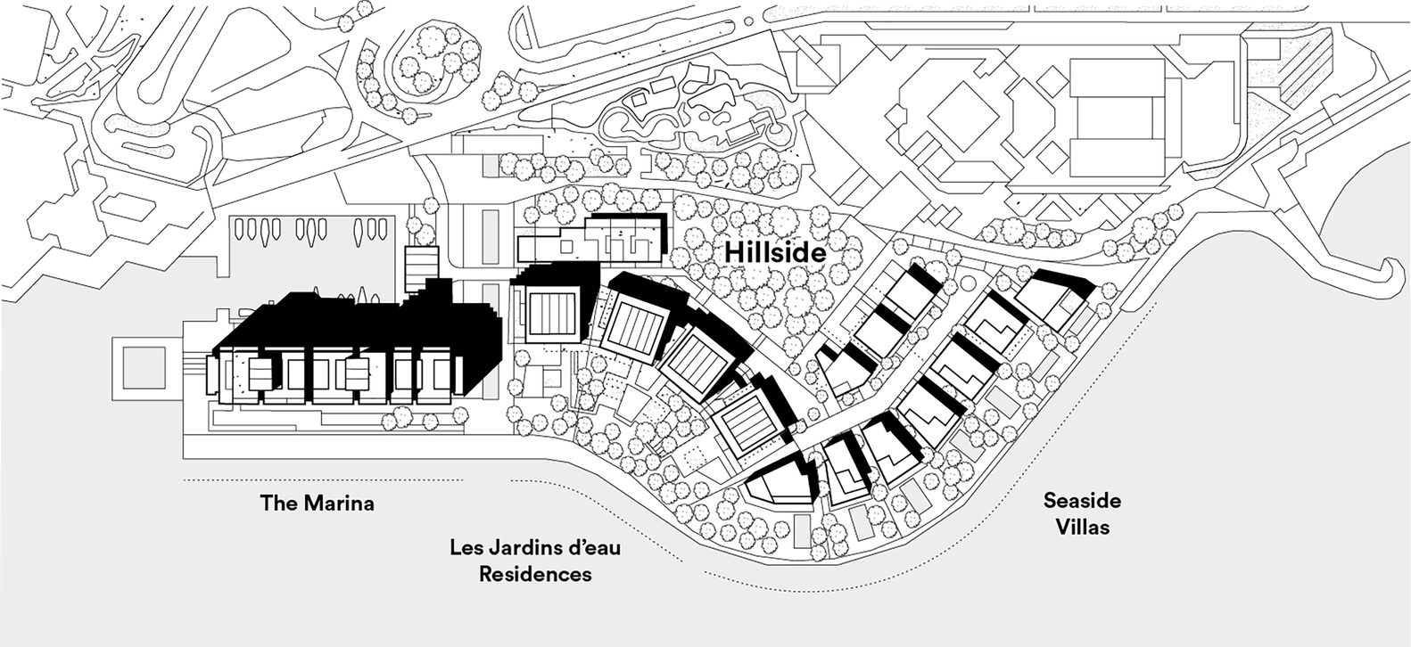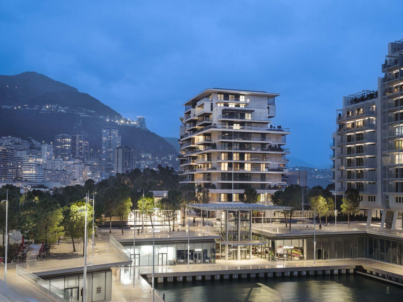 The platform thus constructed has been raised at its center by the creation of a hill lushly planted with large stone pines, thus giving a more harmonious feel to the new coastline curve around which it winds. The district located on this extension is diverse yet integrated. Villas sit beside the sea, as in the Riviera's earliest urban settlements, then gradually rise to form the upper section of buildings arranged to face the sea. Below the hill, a cluster of showrooms complements the neighboring Grimaldi Forum. The southern part sits alongside a small marina, around which restaurants and shops fan out. A large apartment block placed between the port and the sea, on piles, constitutes the project's most maritime part. It was designed by the architect Renzo Piano.