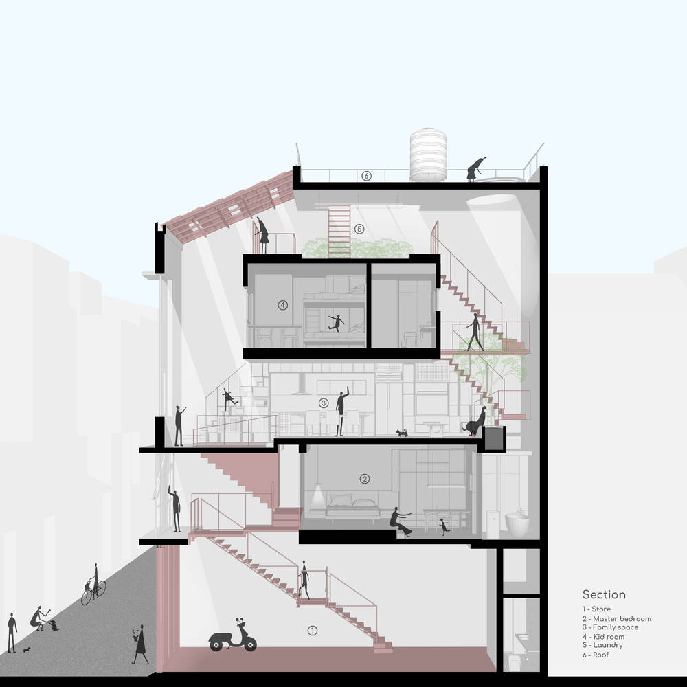 Quan Nhân House is built on a modest plot of land that is located on the narrowest section of Quan Nhân Street and surrounded by a bustling area of shops and services. The house is divided into two main parts: Living Space and Rental Space. The living area is elevated to a certain height to minimize exposure to noise and dust, while also creating an open and airy space for commercial activities on the ground floor.