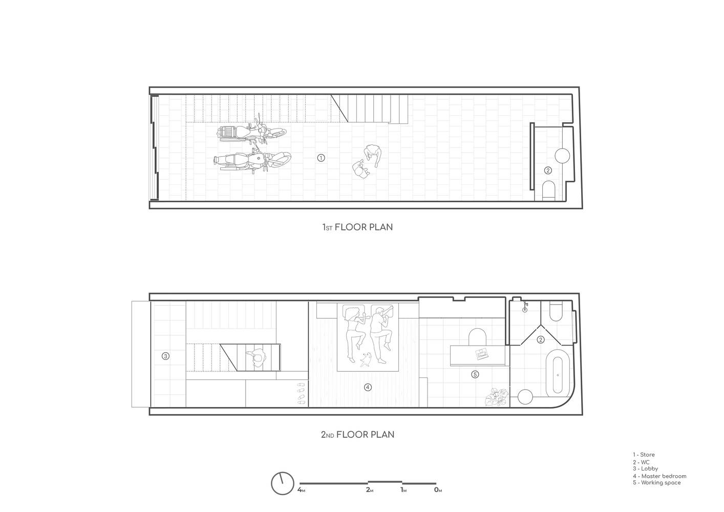 空间策略与功能布局:全宁楼项目最突出的亮点在于其对有限空间的精妙利用。建筑师巧妙地将居住空间抬升,与底层的商业活动区形成鲜明的功能分区,有效隔绝了噪音和灰尘,同时优化了底层商业的采光和通风。这种垂直分层的设计不仅解决了城市环境的挑战,还创造了多样化的空间体验。平面图展示了楼层之间清晰的功能过渡,体现了设计者对空间使用的精准把控。这种“前店后居”的模式,既满足了业主的生活需求,也兼顾了商业价值,体现了设计的实用性与创新性。