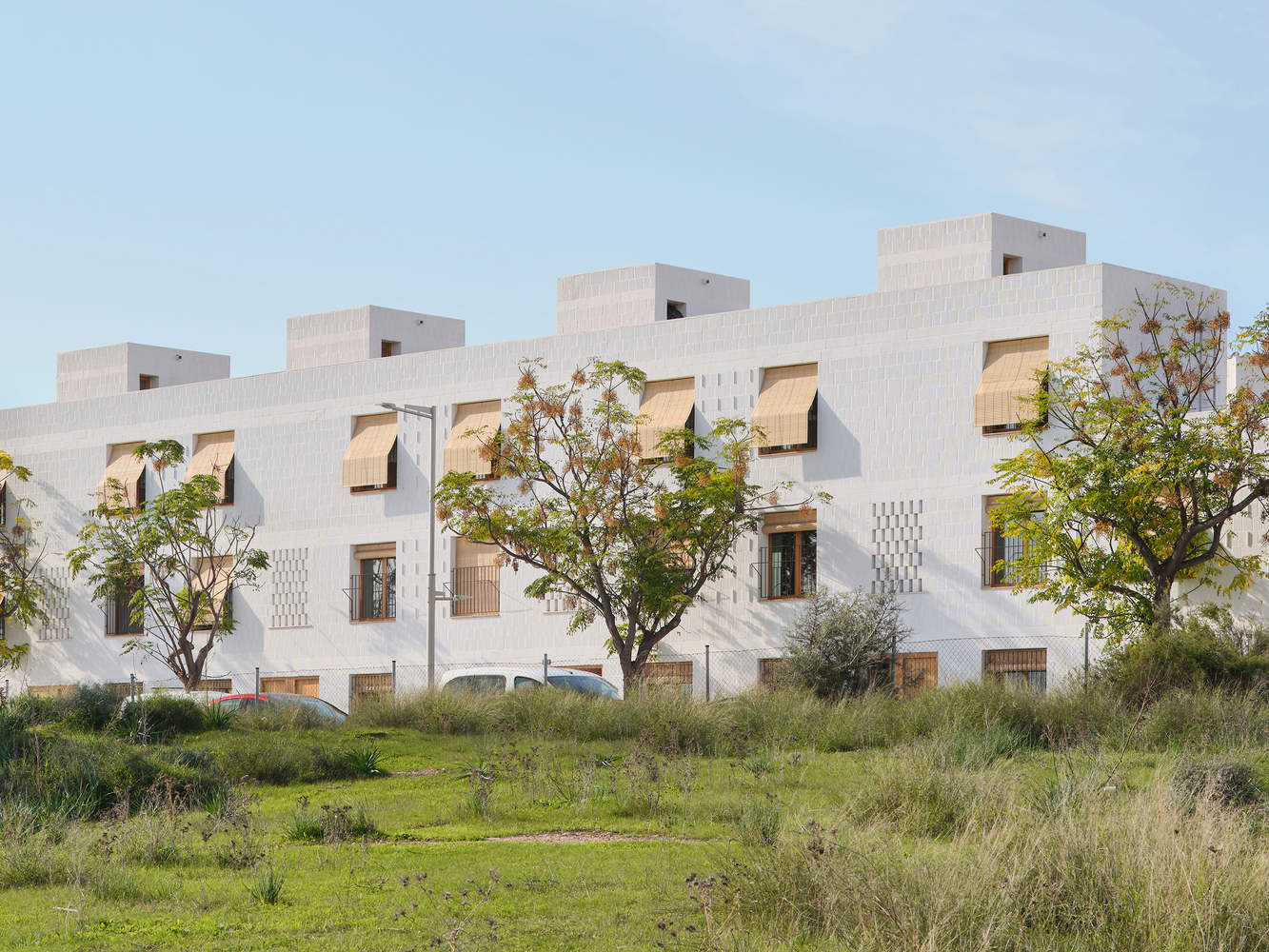 适应气候变化这些房屋的设计是为了通过乡土建筑中典型的被动策略来适应气候变化。通过对面立面的开口和楼梯间的天窗确保所有房间的交叉通风,这些天窗充当太阳能收集器和散热器。西立面的体积退缩有助于将房屋遮挡在最不利的方向。