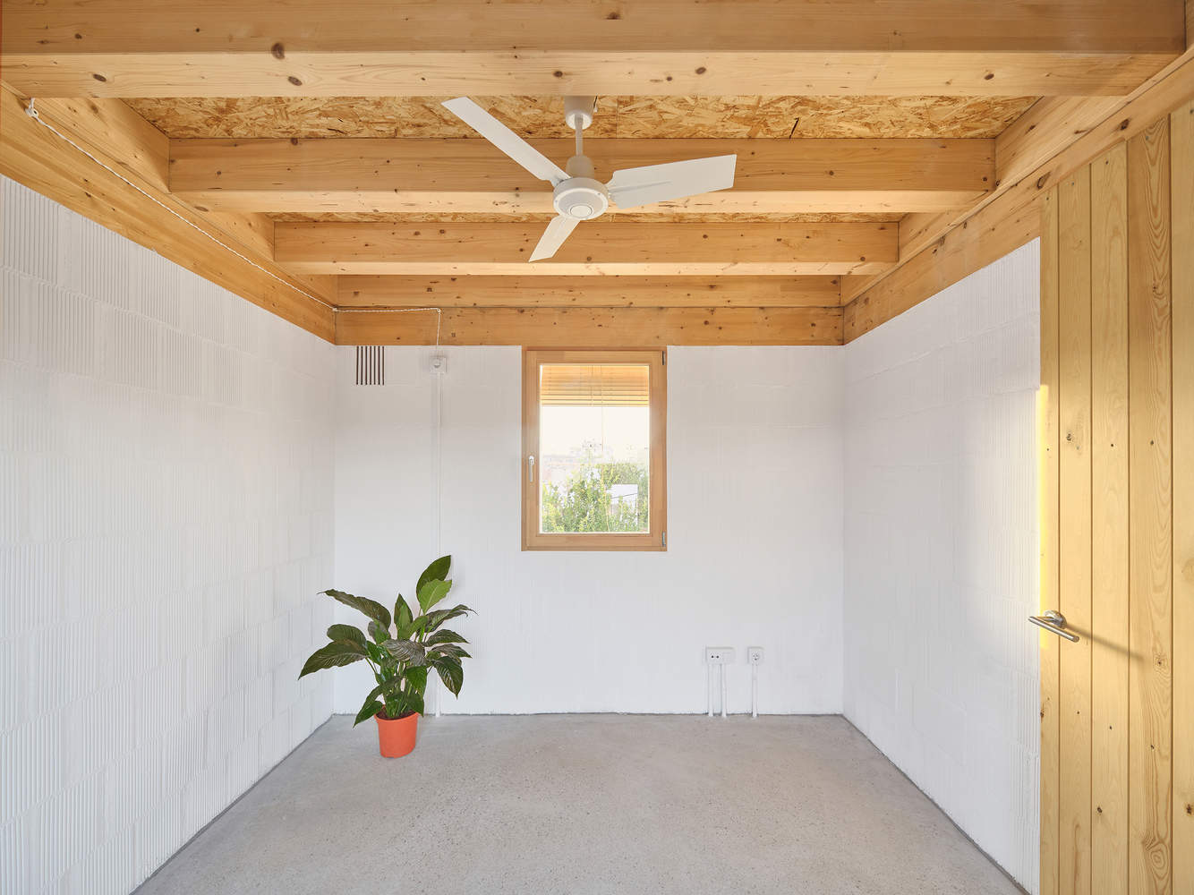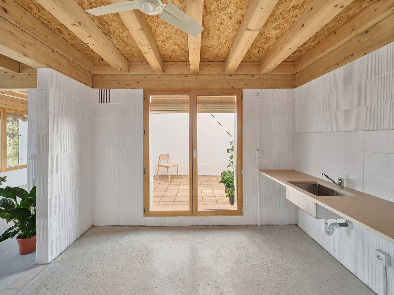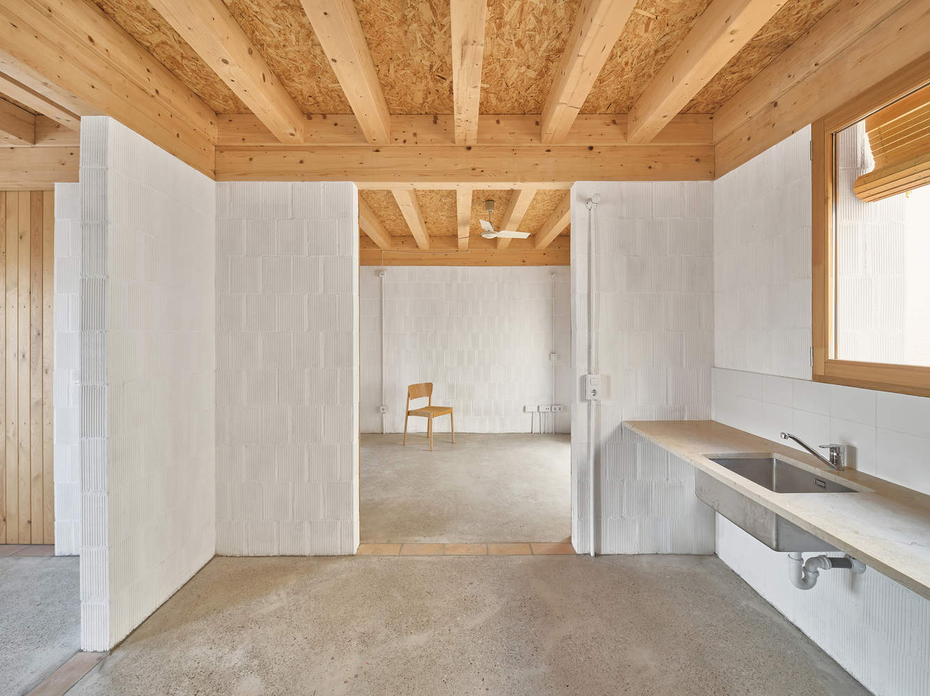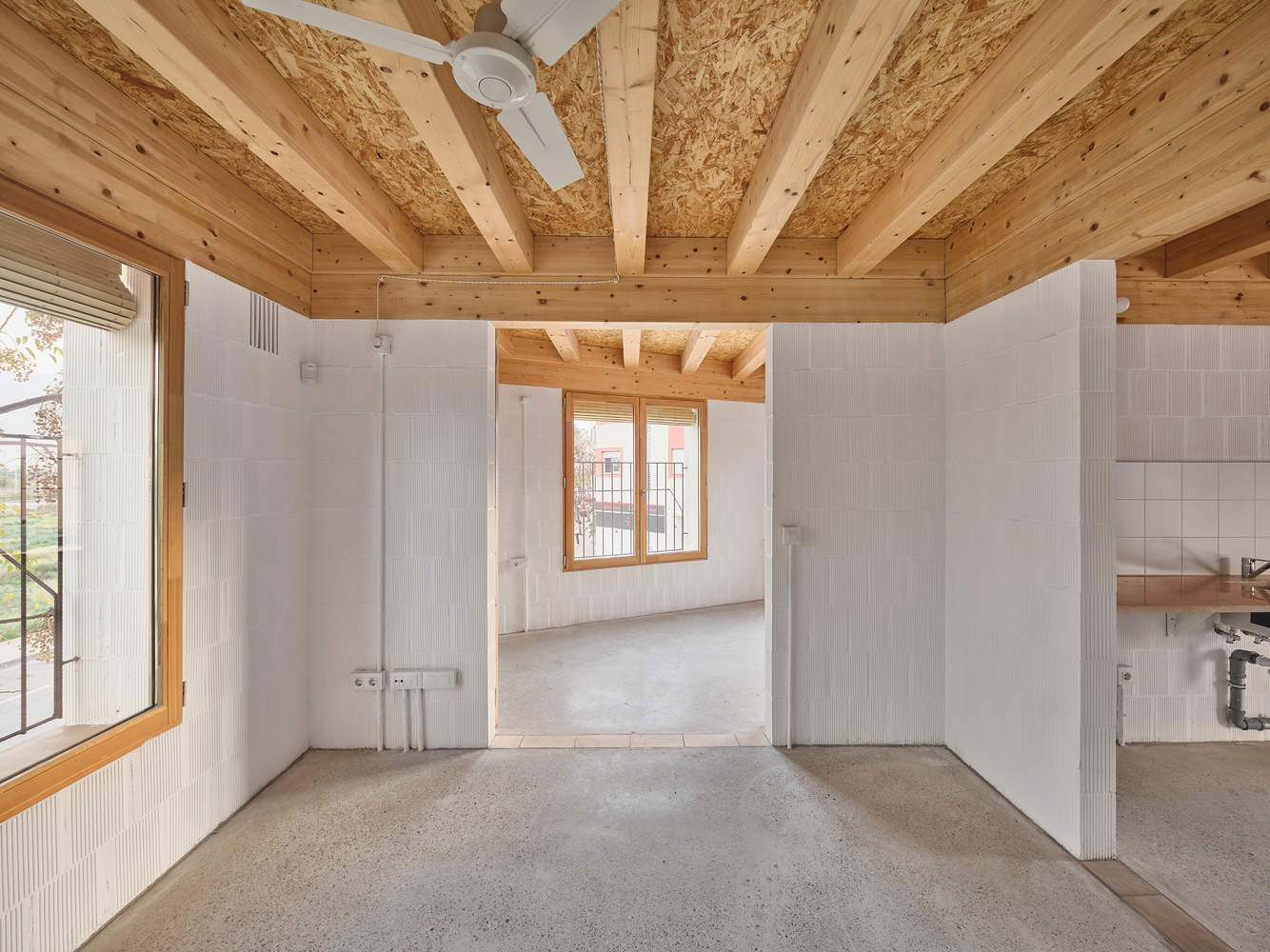 The structure consists of load-bearing walls made of Mallorcan ceramic blocks (H20), forming a grid of equal spaces of 10 m² and technical modules that house the staircases, bathrooms, and solar chimneys. The masonry incorporates vertical perforations filled with earth from the excavation to improve thermal inertia and acoustic insulation between party walls.