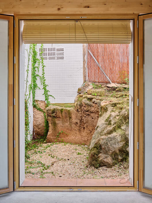The decision to separate the building from the party wall and preserve the existing geological remnants defines a dual strategy in the project's form factor: on one hand, the exterior facades present a compact and regular volume oriented towards the southeast, while the interior facade is set back, avoiding the maximum allowed occupancy. This volumetric configuration enhances the building's passive performance by generating shadows and variable surface courtyards that offer multiple outdoor spaces associated with the homes.