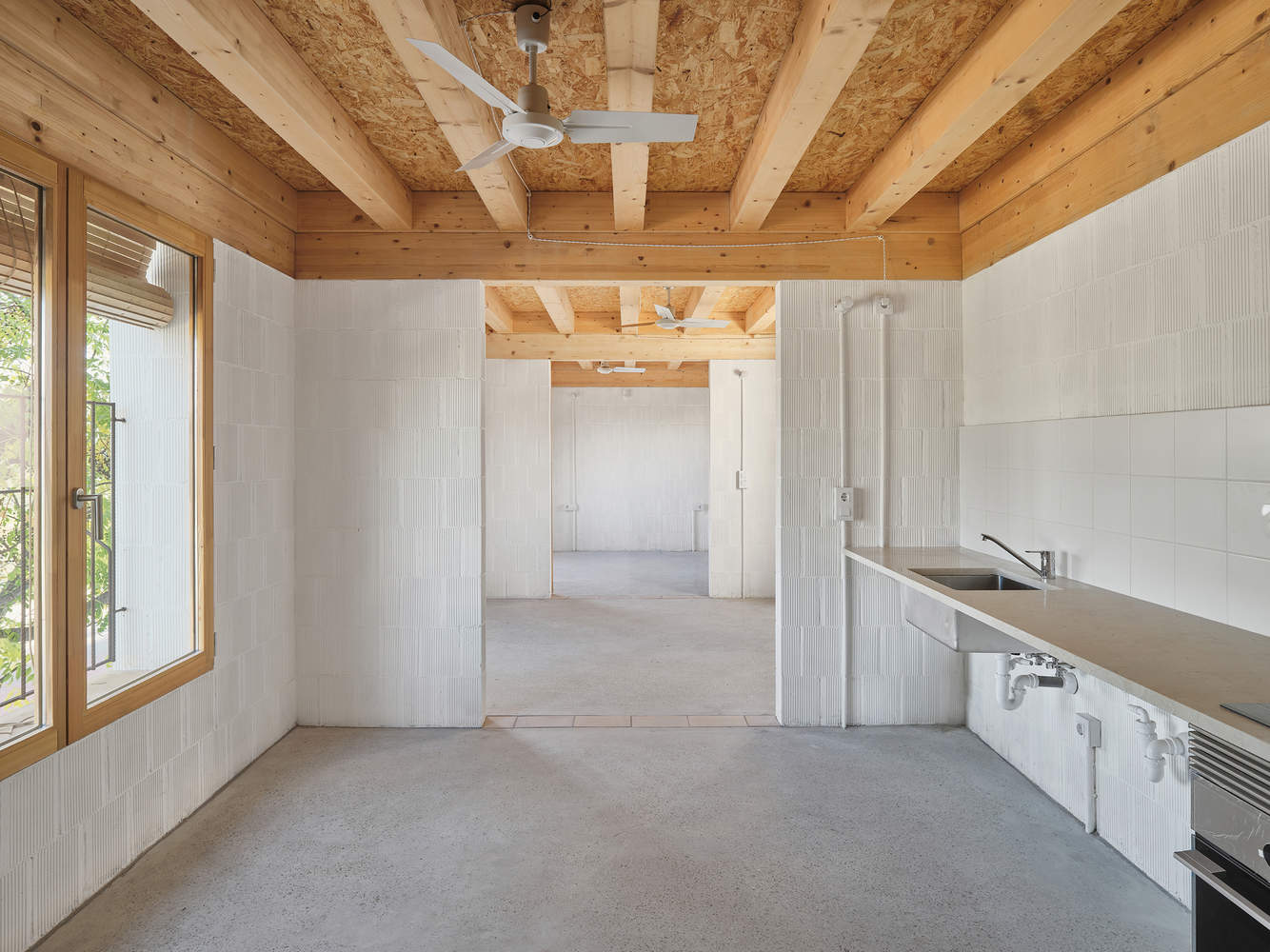 The prefabricated slabs rest on a laminated wood perimeter beam, which resolves the lintels of the interior openings and facades, allowing for dry disassembly and future recycling of all horizontal partitions. A 5 cm compression layer and a polished concrete floor complete the slabs, ensuring acoustic insulation between floors.