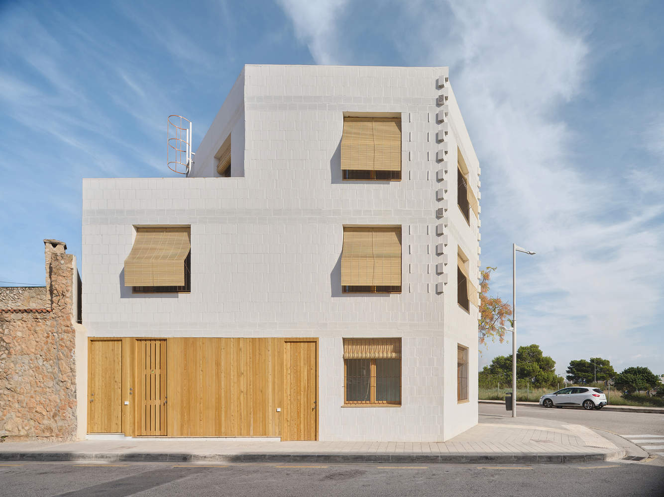 The arrangement of openings and the reduced depth of the interior spaces significantly decrease the need for artificial lighting and optimize solar gain management throughout the year. The facade is finished with a lime render (jabelga) that guarantees waterproofing and seals the joints. Its white color, along with the protruding elements of the facade, minimizes overheating of the envelope.