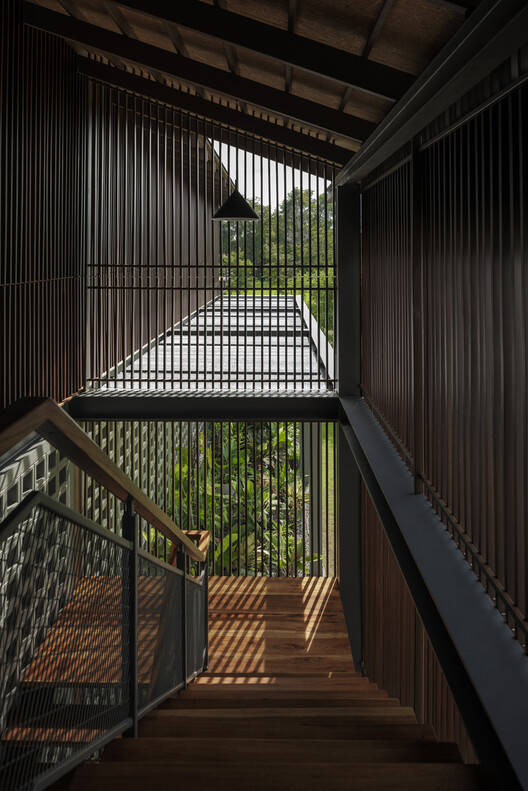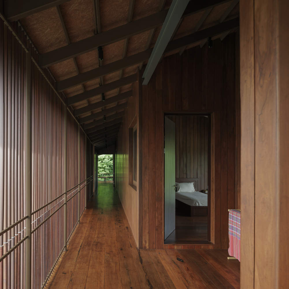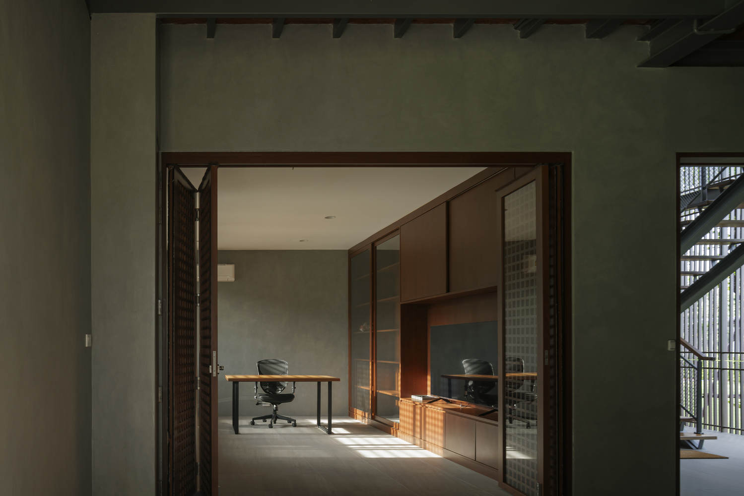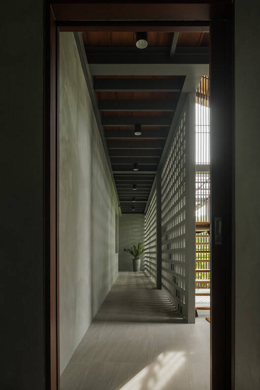 最深的一层是父亲的卧室,供那些选择睡在底层的人使用。他希望它通风良好,同时在晚上保持高度安全。设计师设计了一堵墙,让空气在里面流动。卧室的另一边是一扇木门,白天可以旋转打开以欣赏外面的景色,晚上可以关闭并锁上以确保安全。第二层被设计成房主的卧室。主卧室前面的一个大阳台与走道阳台相连,可以看到一望无际的稻田。它还可以作为一楼的遮阳篷。