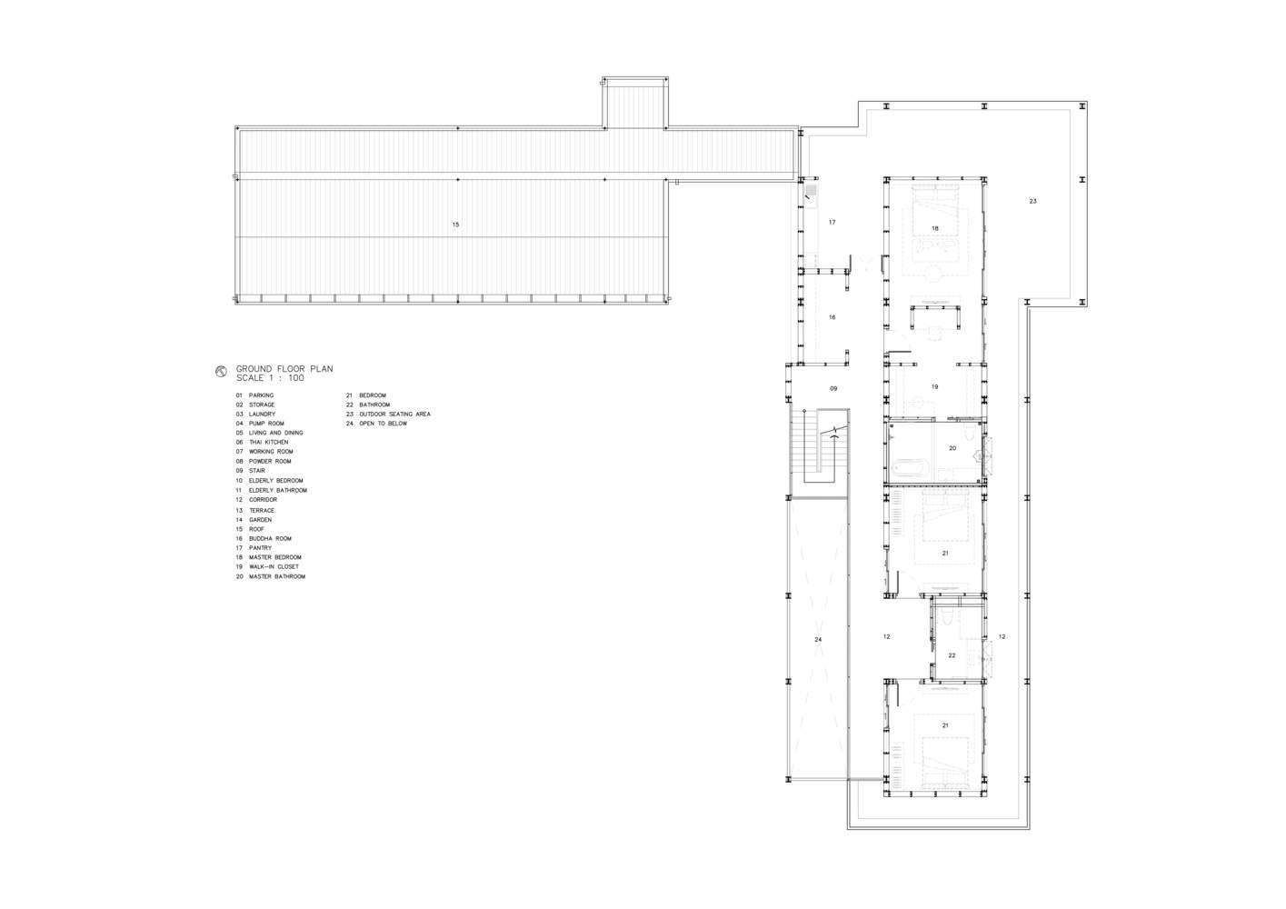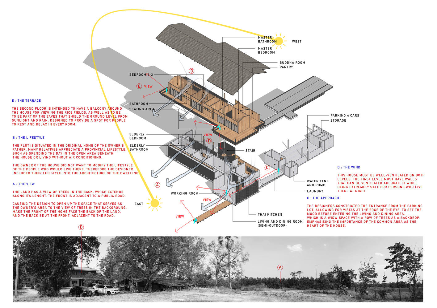 这所房子是从主人父亲的生活方式演变而来的,其中包括偏爱木材和传统的泰国住宅,以及住在泰国房子下面的空间里。创作者希望父亲能够继续过着正常的生活,而不必修改他的使用模式,从而提高便利性和安全性。房主已经习惯了现代住宅,所以他们不需要改变自己的行为。