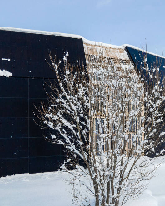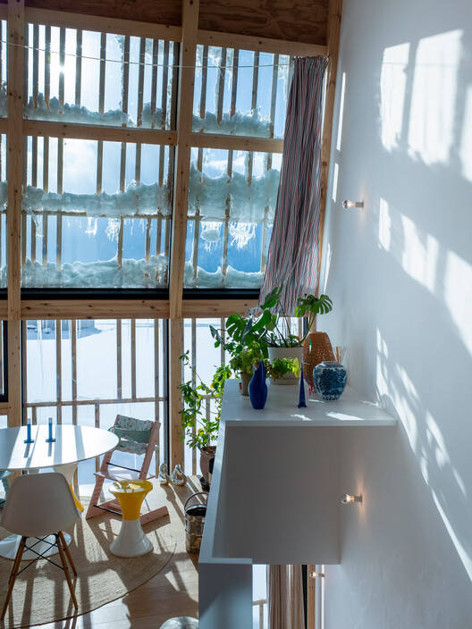 打破契约。正如简短和预算所暗示的那样,我们从一个紧凑的体积开始,让人联想到当地的谷仓。尽管早期的研究试图通过多边形足迹或分支直接朝向三个主要方向,但导致最终结果的设计更加残酷和微妙:将紧凑的体积分成两个,并旋转每个体积,使细长体积的短端完美地面对东部和西北部的山脉,开辟了一个朝向西南部富良野滑雪场的间隙空间。与早期的研究不同,打破保持了紧凑型的体积简单性。间隙空间揭示了紧凑体积的内部是一个脆弱的柔软内部世界,与均匀的坚硬外部形成鲜明对比。仿佛折断的树枝的血管组织没有完全切断,木制内部继续在房子的两半之间流动。间隙在调节建筑气候方面起着关键作用:它是房屋的枢轴,所有运动——垂直和水平、人力和基础设施——都通过它。太阳的影响是通过百叶窗调节的,在夏天阻挡太阳光线,在冬天让它们充满室内。