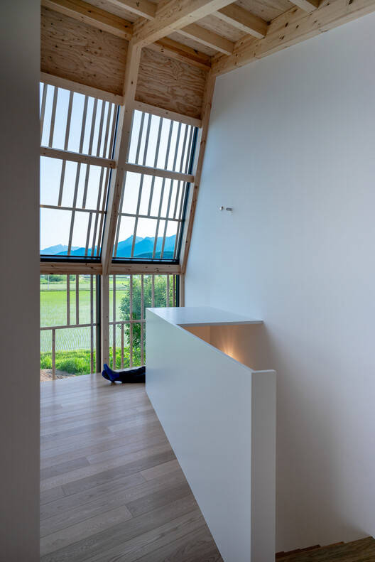Farmland efficiency. Consistent with these ambitions, they have bought a piece of land in the middle of active agricultural production: Farmland efficiency rather than countryside romanticism. Originally the site of a farmer's barn, our neighbors are rice paddies and asparagus fields, irrigation channels, and roads. We are in the open. The only context is (mostly man-made) nature.