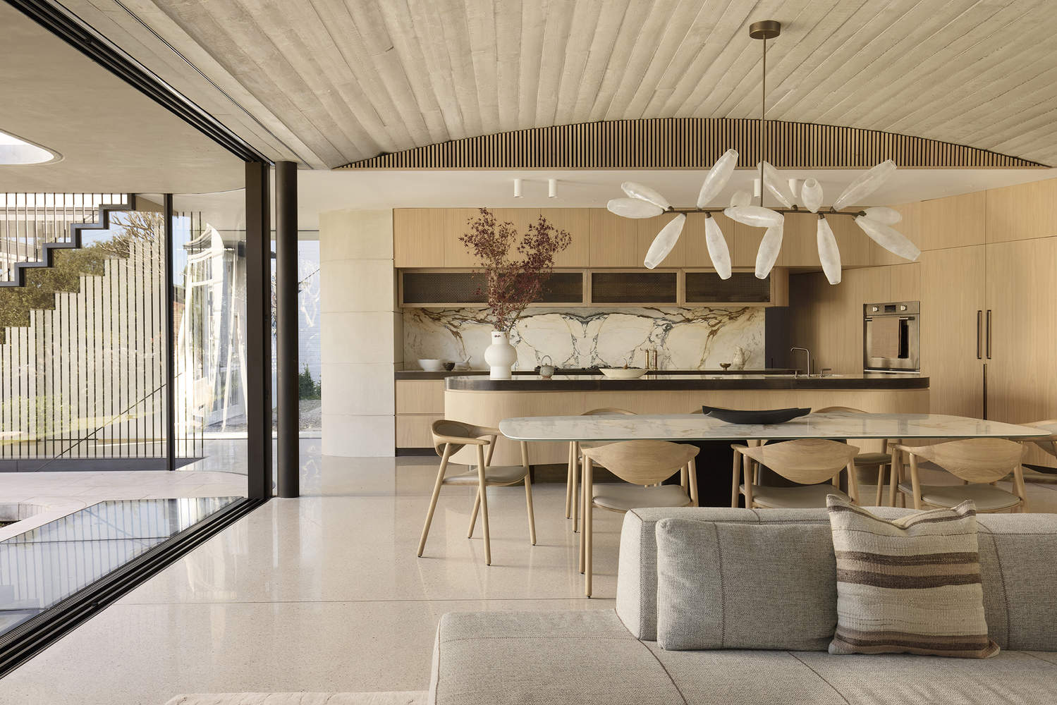Luigi Rosselli Architects' design for the subterranean swimming pool drew inspiration from the cryptic nature of the place. Excavated from the sandstone rock ledges that characterize large areas of Sydney's lower north shore, the pool had to speak the language of the stonemasonry. While clearly architecturally striking, the parabolic arches also happen to be the most structurally efficient shape capable of carrying the load of the multiple levels situated above the pool. Skylights cut into the floors of the two levels above the pool draw light down into the space and foster a sense of connection to the world beyond.