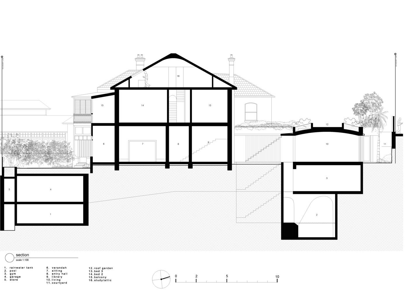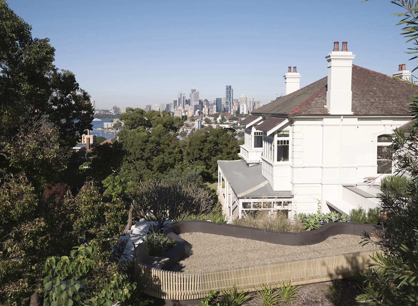 Built for a successful accountant, the original two-story dwelling stood tall on a large parcel of land blessed with views down to Sydney harbor and the city of Sydney opposite. In considering the design for the new additions, there was a requirement to retain what remained of the garden after a significant portion of the original plot was sold off in the 1990s for the development of townhouses. To achieve this aim, the solution was to demolish a more recent garage addition and replace it with a new wing that covers four levels, including subterranean spaces and a roof garden akin to an iceberg tip, which occupies the space where the 'upper' garden of the property used to be. Housed within the upper level of the additions are a new kitchen, dining, and sitting room; a contemporary space that complements a modern lifestyle, enhanced by easy access to the light and airy garden space. The lower levels contain a wine cellar, and all the apparatus: a gym, massage room, sauna, spa, and swimming pool, necessary for achieving immortality. Along with the more mundane elements to support that aim, such as the plant room, and a water tank for the pool.
