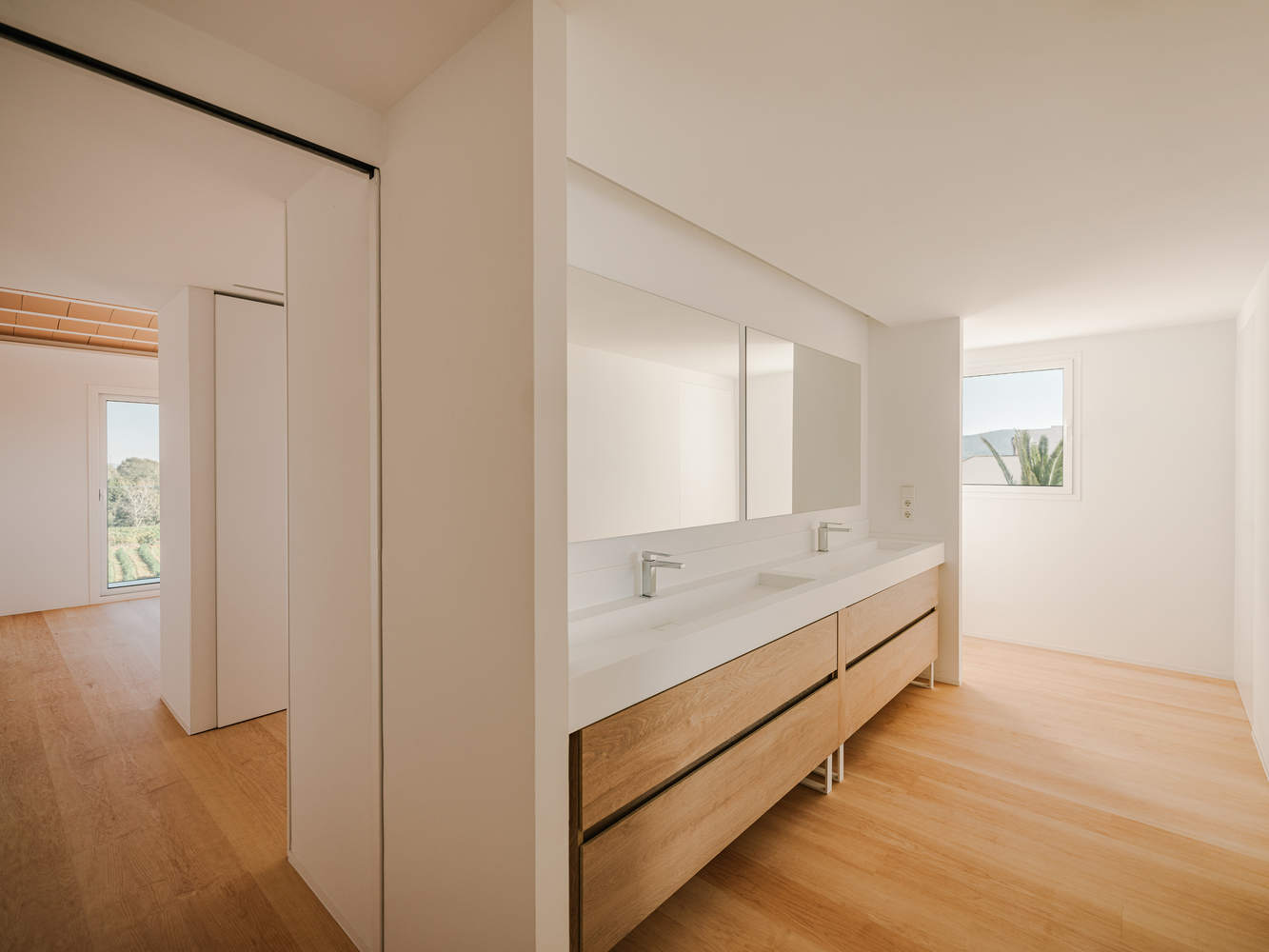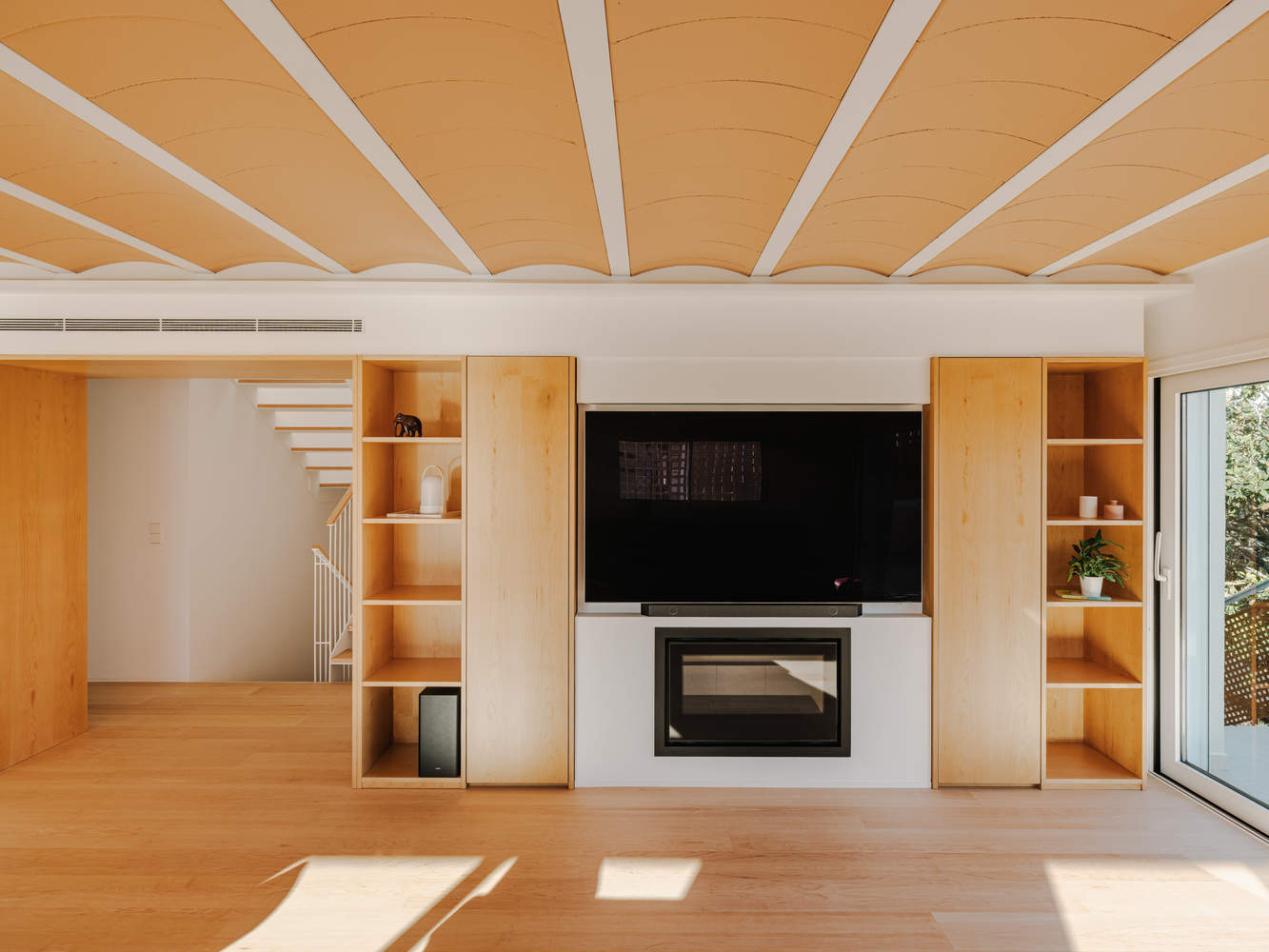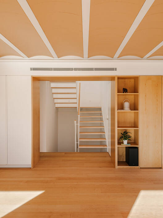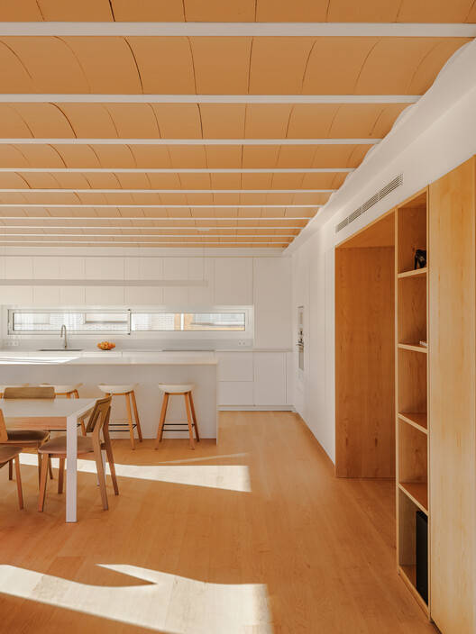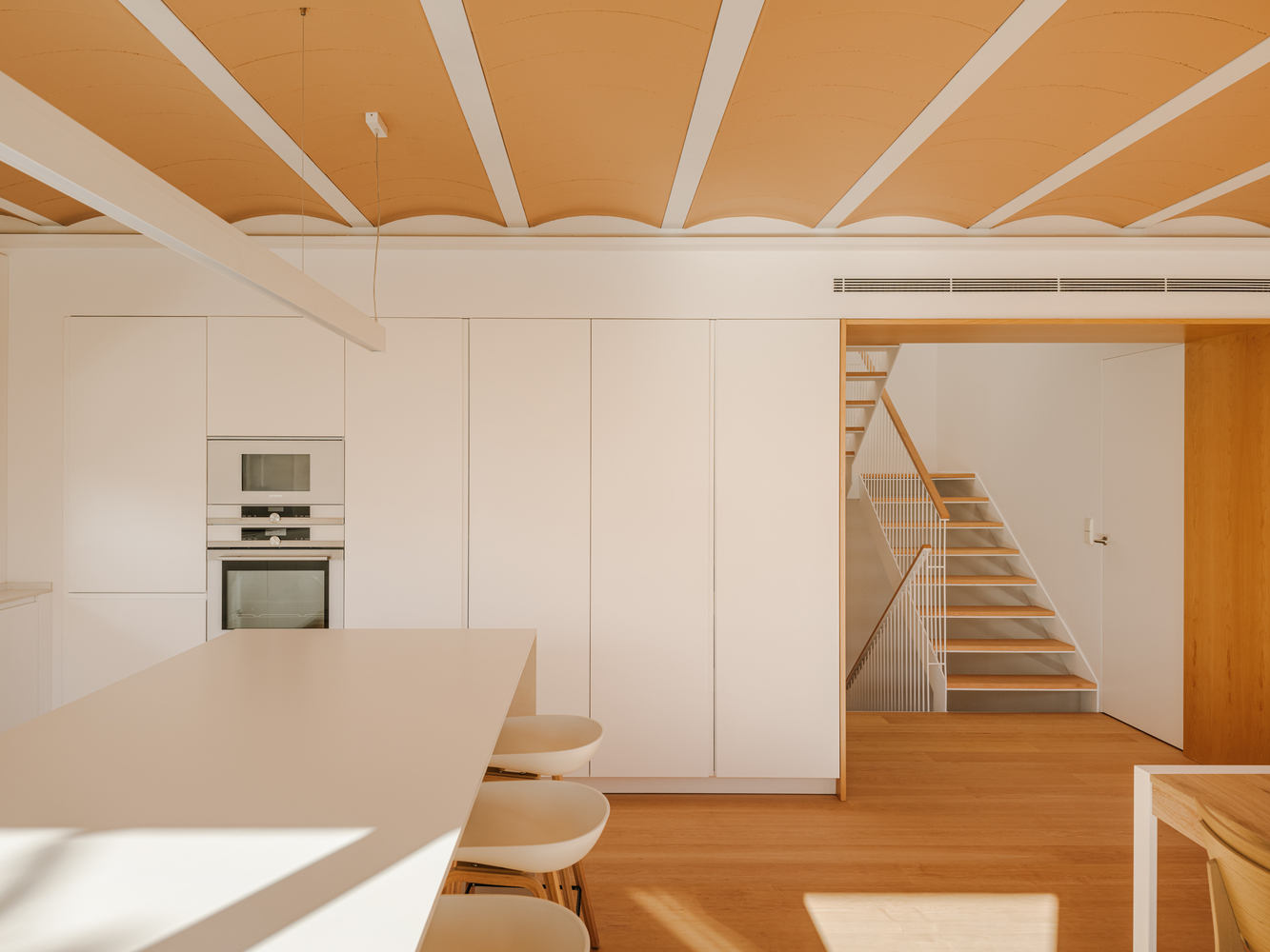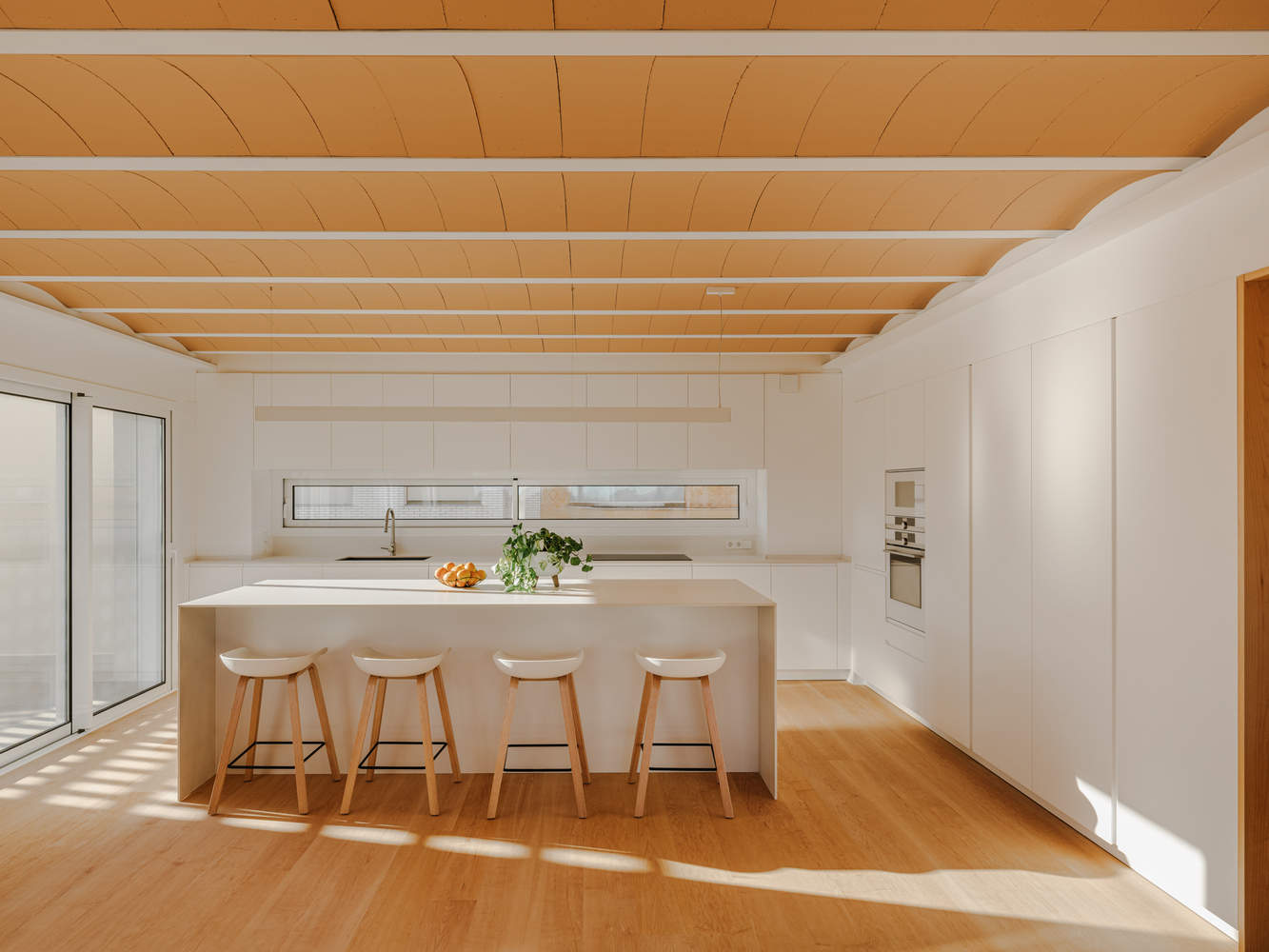 The project's materiality is resolved with a neutral and clean background that highlights the natural wood flooring and the exposed ceramic vaulted ceiling in the main rooms. The same design language is used in the central furniture of the home, which equips both the kitchen-dining area and the living room, organizing the space.