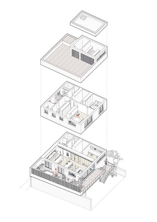 The program is configured radially from the vertical communication core towards the façades, providing all spaces with natural lighting and ventilation. Openings are created in the exterior terrace spaces with a south-facing orientation, connected to the day zones. These become new outdoor communal spaces, defined by a permeable ceramic closure to maintain privacy while allowing light to pass through.