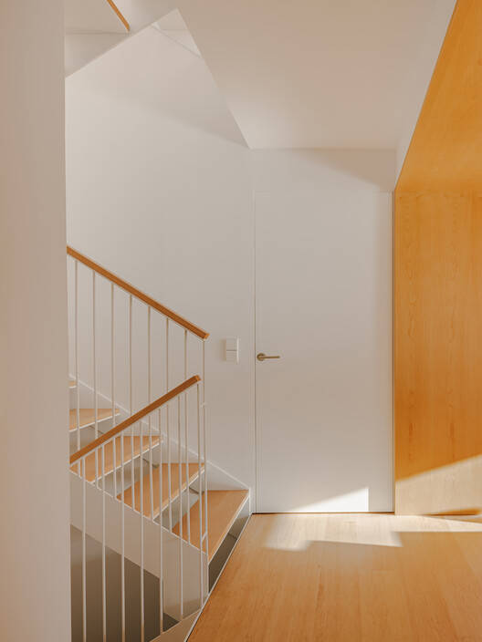 空间组织与采光设计:该项目最显著的亮点在于其对空间组织的巧妙处理。利用现有车库的结构网格,设计师创造了开放的楼层平面,并用楼梯核心和湿室进行分隔,实现了功能分区与空间流通的平衡。从垂直交通核心向立面呈放射状的布局,确保了所有空间都能获得充足的自然采光和通风,这在城市住宅设计中尤为重要。朝南的外部露台与日间区域相连,创造了新的户外公共空间,并用可渗透的陶瓷围合,既保证了私密性,又能让光线自由穿透,体现了对居住者舒适度和采光需求的深度考量。