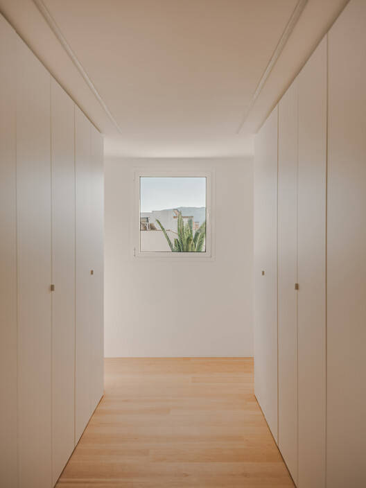 该项目的物质性通过中性和干净的背景得以解决,突出了主房间的天然木地板和外露的陶瓷拱形天花板。同样的设计语言用于家庭的中央家具,它配备了厨房用餐区和客厅,组织了空间。