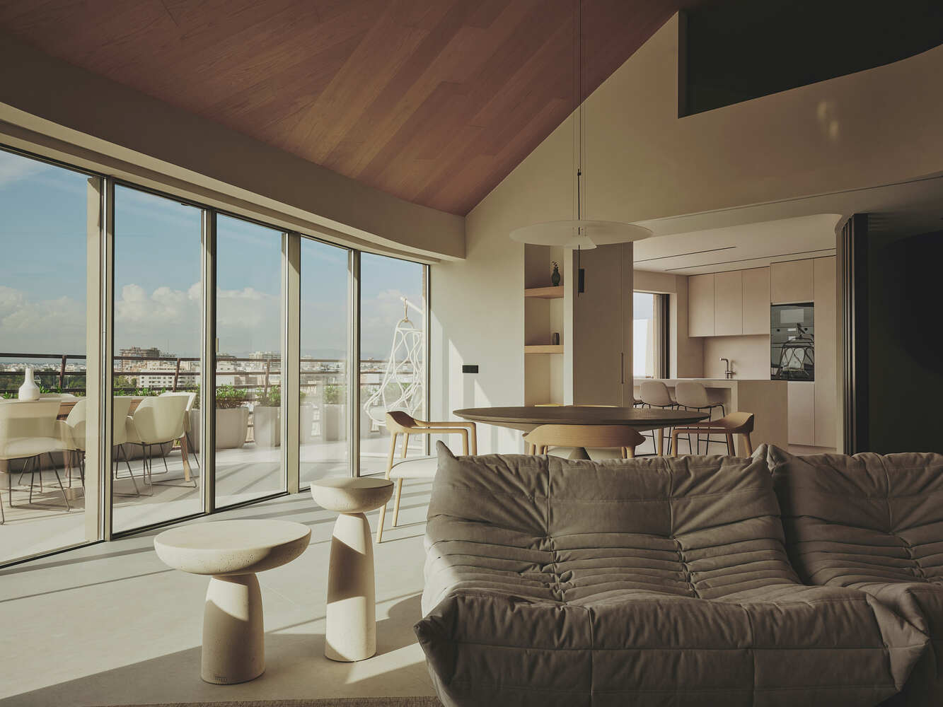 The materiality of the house continues with the idea of the project, which is none other than to focus attention on the views of the Turia, and therefore aims to act as a backdrop without elements that distract attention or stand out from the views. The sloping ceiling is covered with natural wood, evoking the cozy atmosphere of a cabin, and the walls are covered with soft-toned mortar for a calm enjoyment of the views over Valencia.
