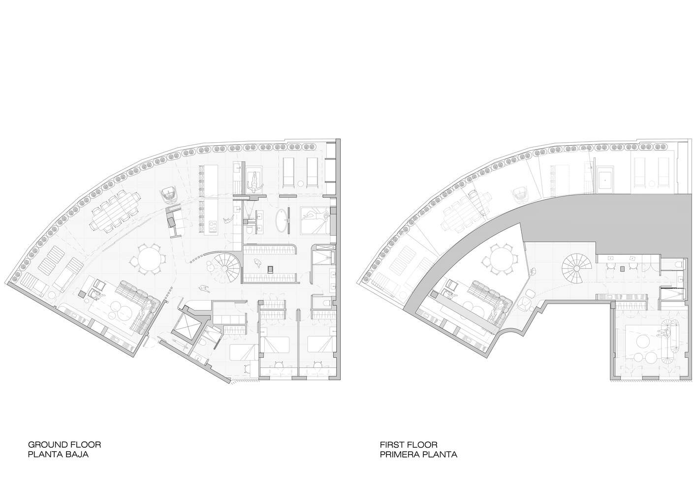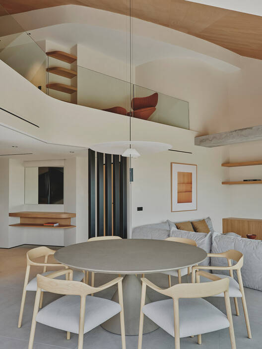 Text description provided by the architects. Curved Attic is the renovation project of a unique property in the centre of Valencia with privileged views over the old Turia riverbed. The architecture of the building itself, with a circular envelope, allows these views to extend along the house, being a characteristic of such strength that it gives its name to the project and around which the main idea of the project is developed. From a first approach to the project, the intention was to clear the interior of the house to allow views of the outside from almost every point. This involved placing the most used areas (day zone, kitchen and master bedroom) attached to the façade, as well as demolishing an overbuilt mezzanine that compressed the living area, leaving it now with a double height that underlines the sloping roof of the building.