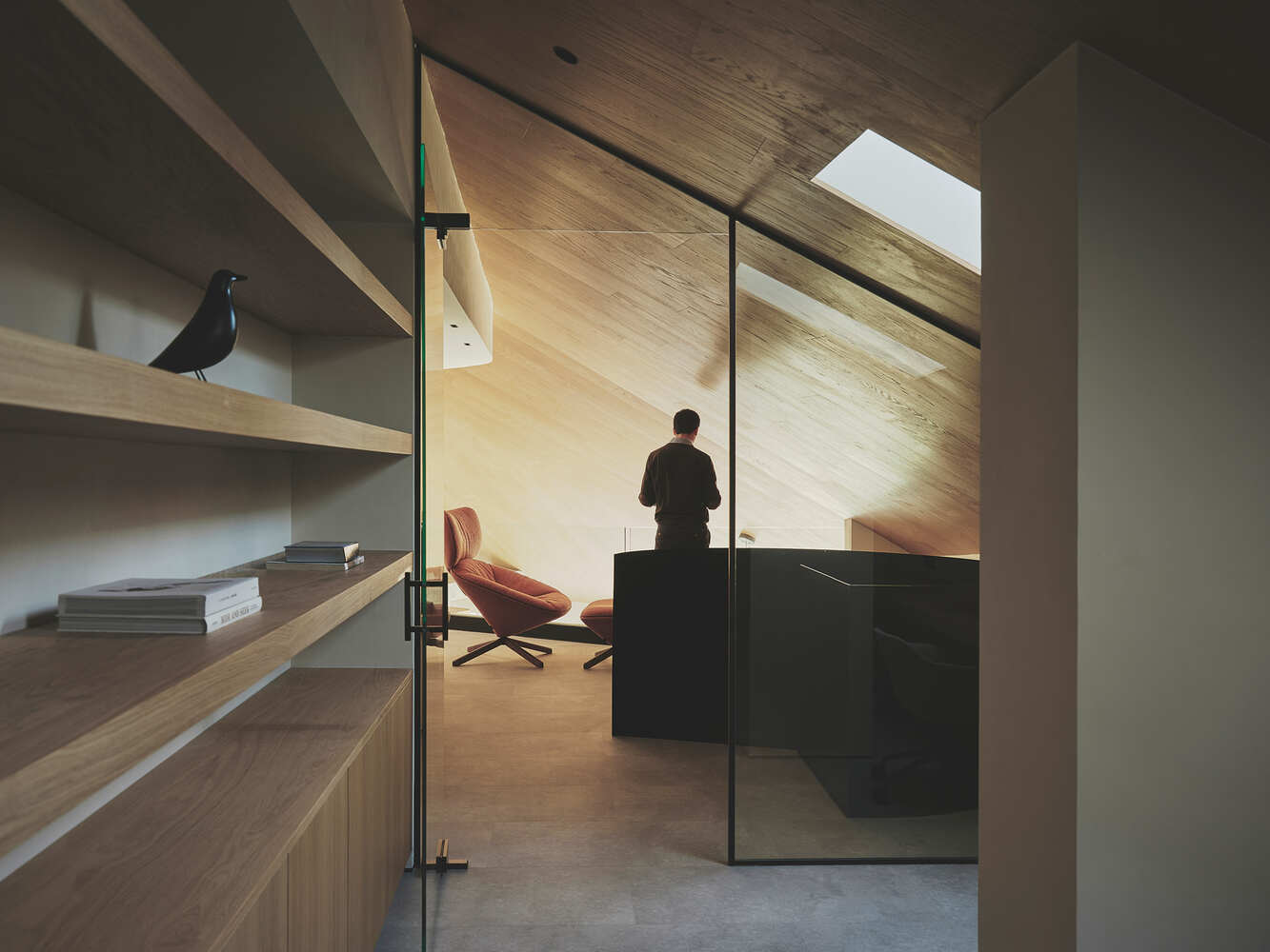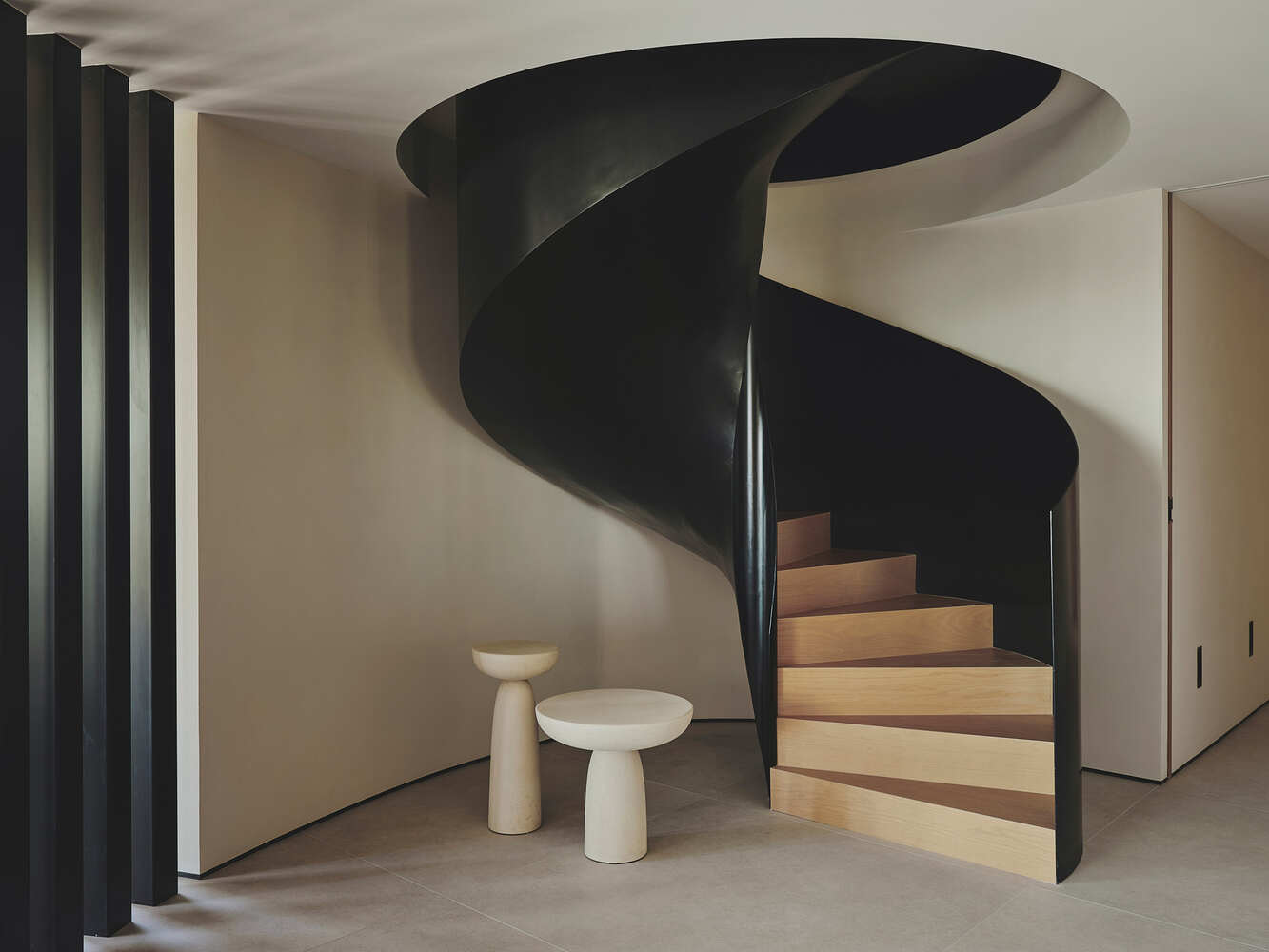 材质与细节的统一性:项目的精髓在于对材质和细节的统一性把握。室内设计采用了天然木材覆盖倾斜的天花板,营造出温馨舒适的氛围,与外部景观形成对比,进一步突出了景观的重要性。墙面则采用了柔和色调的砂浆,形成了一个平静而和谐的背景,从而更好地衬托出外部的景观。连接上下楼层的螺旋楼梯,不仅是功能性元素,更是作为雕塑般的存在,以其黑色的弧形铁表面和天然木质内阶,成为空间中的视觉焦点,体现了设计者对材料、光线和形式的深入思考与完美结合。
