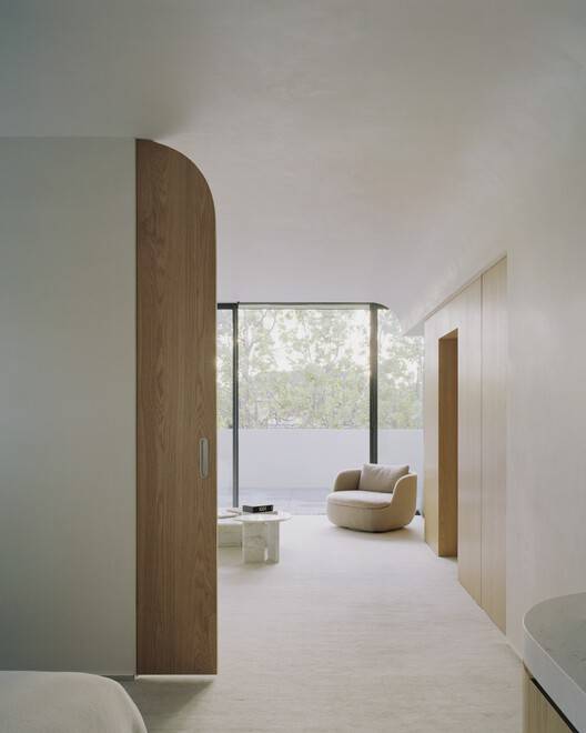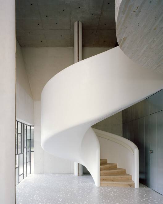 穿过混凝土立面,它似乎漂浮在前花园和一条精致的图案玻璃带上,双层高的门厅空间显露出来。封闭的螺旋楼梯和弯曲的主生活空间以抽象的砖砌形式突出到空间中。在门厅空间之外,材料的并置展开;未经加工的混凝土立面、黑色木条衬墙、大理石和花岗岩单体、天然锌覆层,与温暖的美国橡木、奶油色克劳斯砖、老化的黄铜细节和抛光的威尼斯石膏并置,天花板连接处曲线优美。柔软材质的矛盾平衡了主要的原材料和坚固的材料调色板,增强和赞美了整个家中明暗的相互作用。