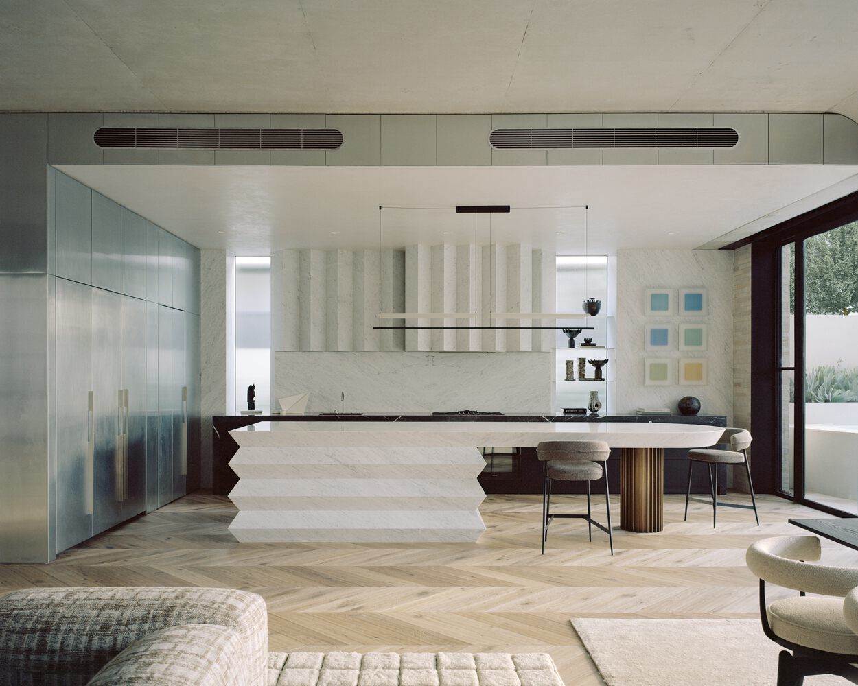 Passing under the concrete facade which appears to float over the front garden and a delicate ribbon of patterned glass the double height foyer space is revealed. Enclosed, a spiral staircase and the curved form of the main living space protruding into the space as an abstract, brick form. Beyond the foyer space, a juxtaposition of materials unfolds; the raw concrete façade, black timber battens lining walls, monoliths of marble and granite, natural zinc cladding, juxtaposed by warming American oak, creamy Krause brick, aged brass details and polished venetian plaster with curvaceous ceiling junctions. The contradiction of soft materiality balances the predominant raw and robust material palette, enhancing and complimenting the interplay of light and dark throughout the home.