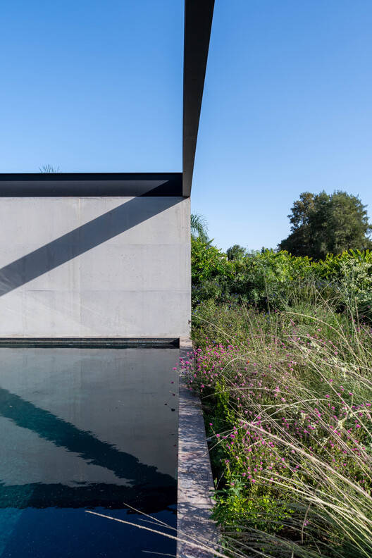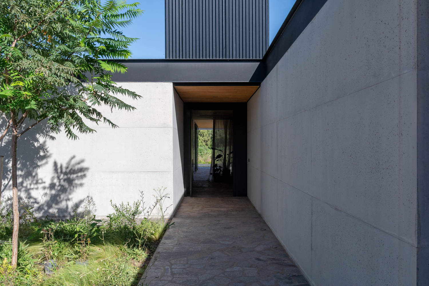 Location and context. Located in the city of Córdoba, in a neighborhood with flat topography and exclusively residential character, this house is characterized by its tectonic nature and its sober, introverted character. The placement on the lot is carried out using concrete walls, which, tied together by a framework of metal profiles, are arranged in a Cartesian manner to seek privacy or generate views. This creates boundaries and patios, as well as openings that connect with the golf course.