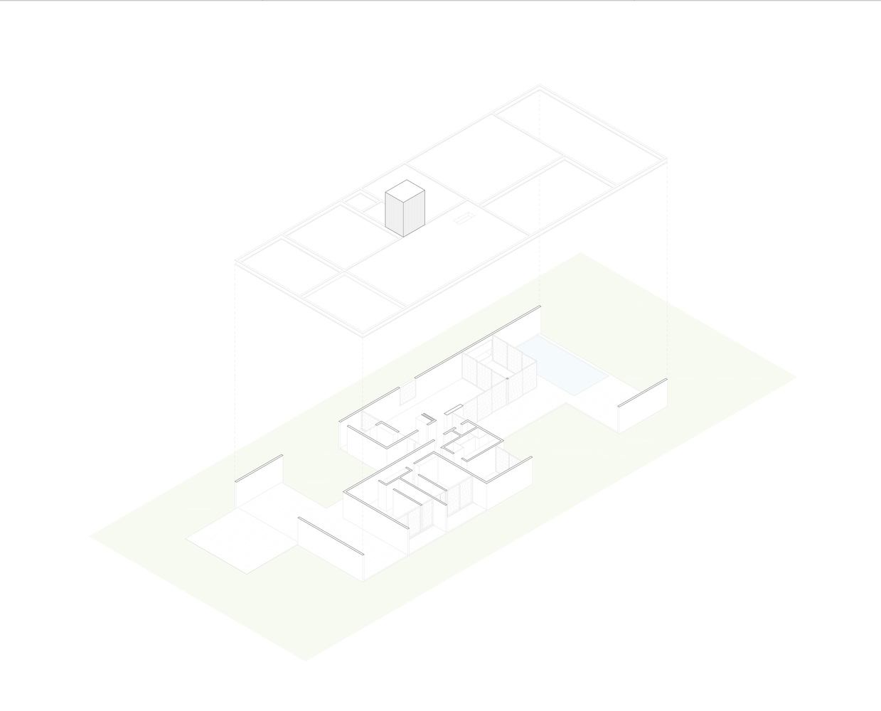 中心轴线在整个房子里呈直线延伸。该轴具有外部和内部的暂停,允许与功能程序连接。它从街道开始,提供车辆和行人通道,穿过内部,进入主要体量,并提供一个通往露台部分的出口,包括一个画廊和一个游泳池,最终形成一个更大的露台,上面有一片草地。