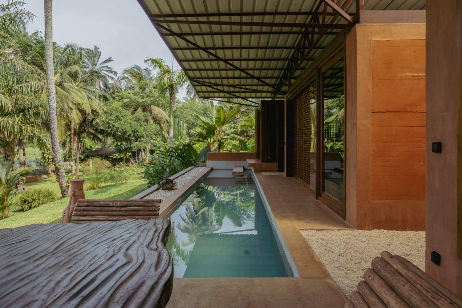 Natural Materials and a Harmony of Colors - Each material has been carefully chosen to harmonize with the landscape while ensuring optimal thermal comfort. The essence of the curtain walls rests on bioclimatic principles adapted to the Ivorian climate. The rammed earth walls, an ancient material with high thermal inertia, regulate indoor temperature by reducing heat fluctuations. The raw earth brick facades offer ideal thermal inertia, while the terracotta floors and kitchen counters combine durability and elegance. The interior floor, blending earth resin and lime stucco, combines softness and robustness. In the bathrooms, tadelakt brings an elegant waterproof touch, while the woven rattan ceilings and carved solid wood celebrate local craftsmanship in a warm and refined atmosphere. The wooden screens, equipped with removable plexiglass panels, allow for a balance between natural ventilation and thermal insulation. Finally, a palette of earthy tones, subtly gradient, blends with the lush green of the garden, grounding the villa in a timeless and organic aesthetic.