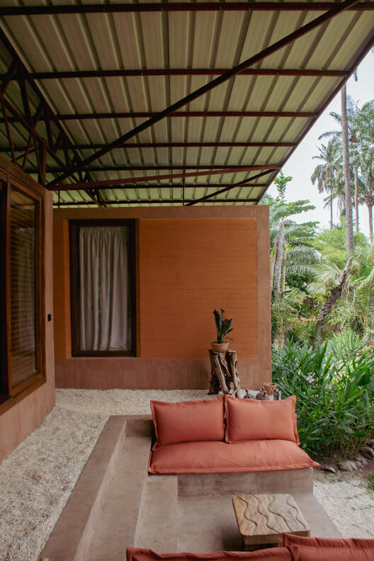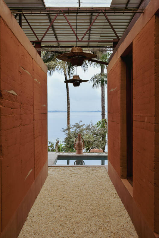 与环境的和谐共生:埃索阿/莫埃索展馆项目最令人印象深刻的亮点在于其与自然环境的无缝融合。建筑师巧妙地利用了泻湖的景观,将建筑融入到7500平方米的植物园中,创造出一种沉浸式的居住体验。自给自足的设计理念不仅体现了对环境的尊重,也为居住者提供了独特的体验。模块化的设计和天然材料的应用,例如夯土墙、赤陶地板等,都强调了建筑与自然的和谐共生,并最大化地实现了生态和生物气候效益。这种设计理念在热带地区尤为重要,能有效提升居住的舒适度。