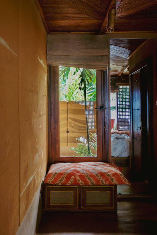 天然材料和色彩的和谐-每种材料都经过精心挑选,与景观相协调,同时确保最佳的热舒适度。幕墙的本质在于适应科特迪瓦气候的生物气候原则。夯土墙是一种具有高热惯性的古老材料,通过减少热量波动来调节室内温度。生土砖外墙提供了理想的热惯性,而赤陶地板和厨房柜台则将耐用性和优雅性结合在一起。内部地板混合了土树脂和石灰灰泥,结合了柔软性和坚固性。在浴室里,tadelakt带来了优雅的防水触感,而编织的藤条天花板和雕刻的实木则在温暖精致的氛围中庆祝当地的工艺。木制屏风配备了可拆卸的有机玻璃面板,实现了自然通风和隔热之间的平衡。最后,泥土色调的调色板,微妙的渐变,与花园郁郁葱葱的绿色融为一体,为别墅奠定了永恒和有机的美学基础。