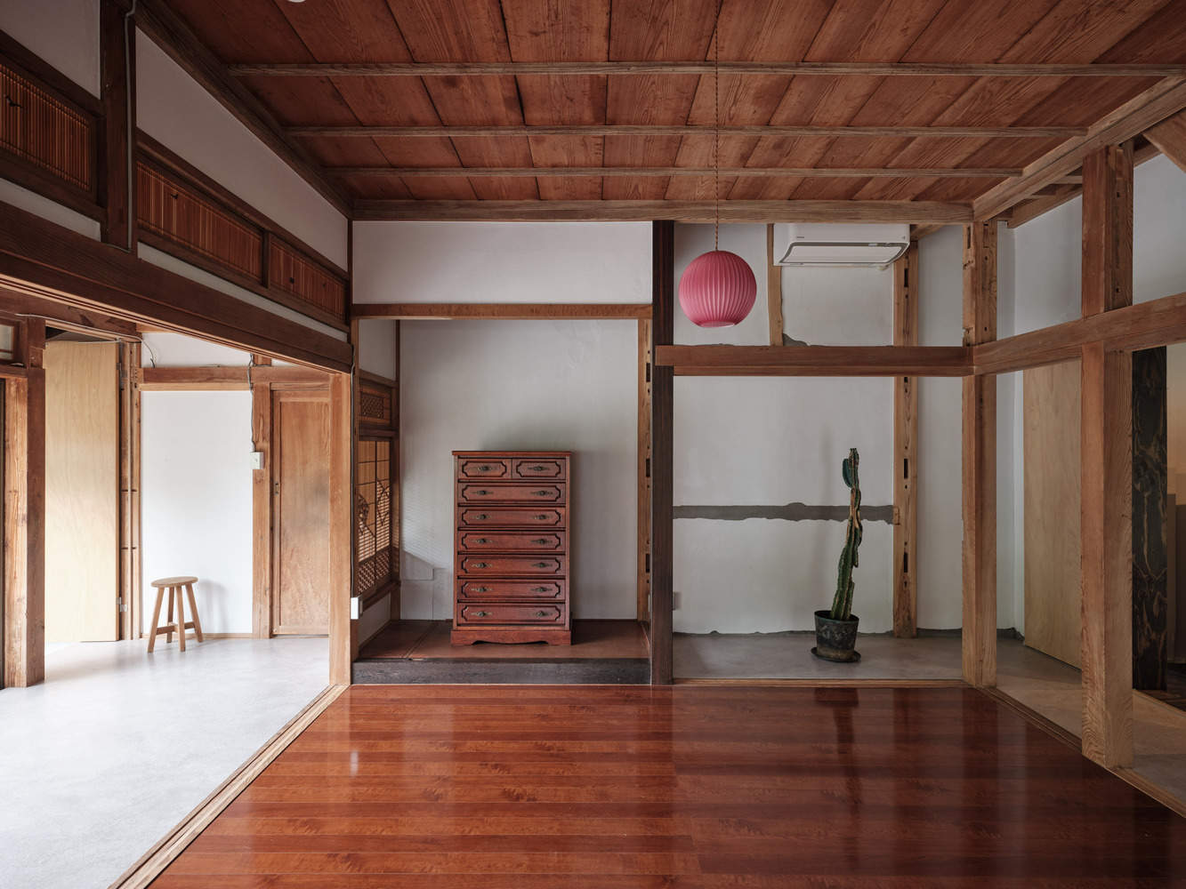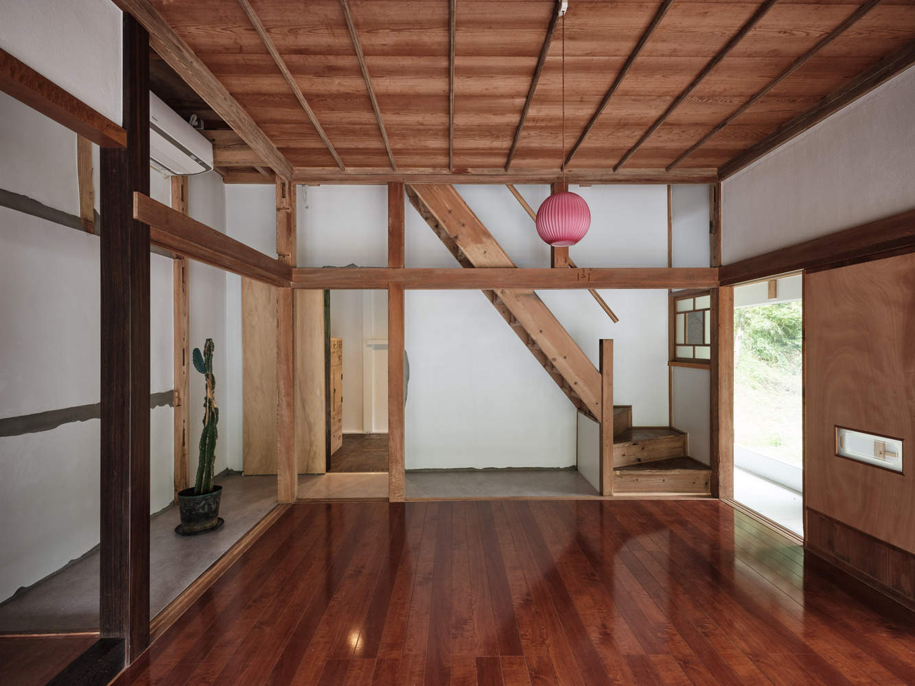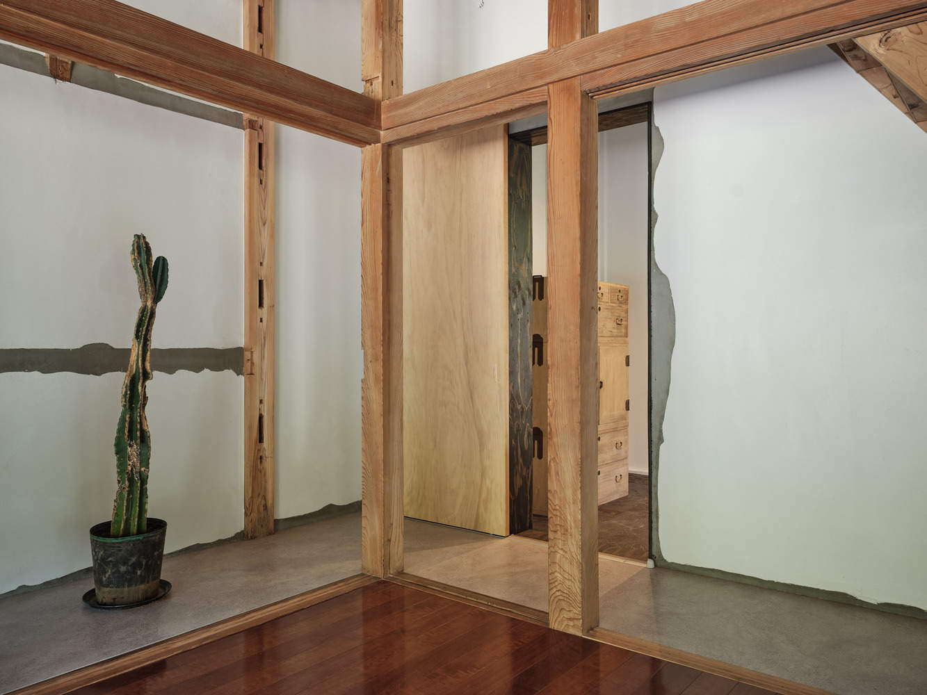 To improve the functionality of the space, the original division between the kura and the main house was removed, creating a more flexible layout. The wall separating the entrances to the kura and the main house was taken down, and the floors of the extended entrance were finished with mortar. A new opening beneath the staircase in the living area on the first floor connected the space to the main living area, opening up new possibilities for the usage of the kura.