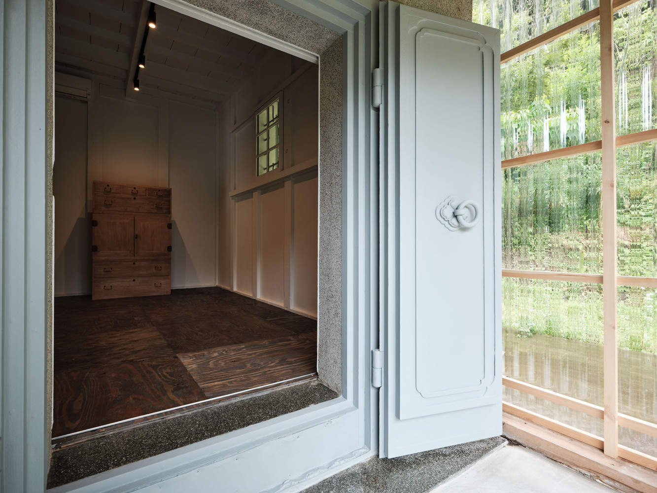 Revitalizing the Kura and Extension – The storage building had its entrance partially concealed by an extension built over the years. To highlight its impressive double doors, the later-added sliding doors of the extension were replaced with a new wall, and a 2m × 2m fixed window was cut into the facade. This frames the kura and its newly repainted entrance doors, making them a striking focal point and a defining element of the home. Inside, on top of the original soil floor, we installed a larch plywood flooring finished in a grey EP wipe-off coating. Clear corrugated polycarbonate sheets were used on the lateral wall of the kura's extension, allowing more natural light to filter in while maintaining a connection to the surrounding environment.