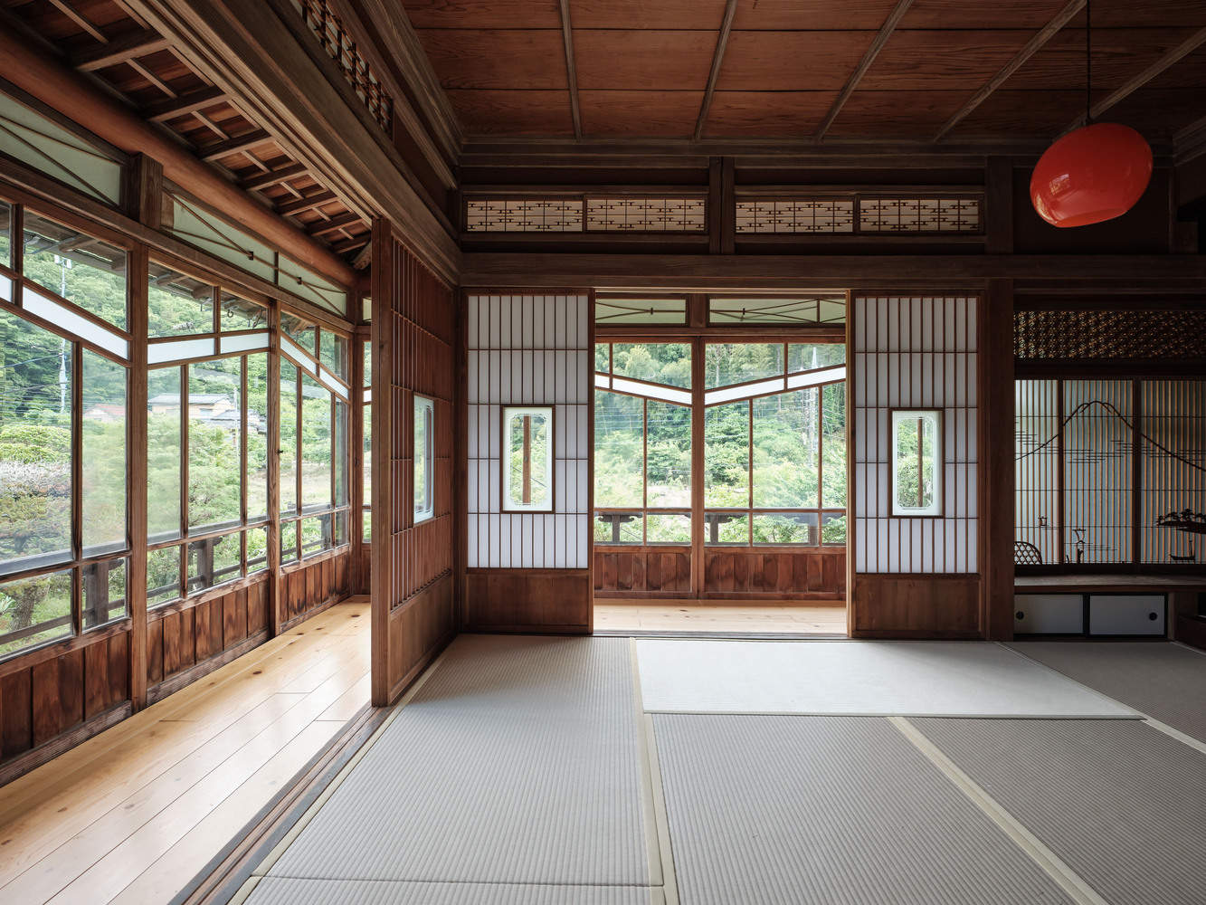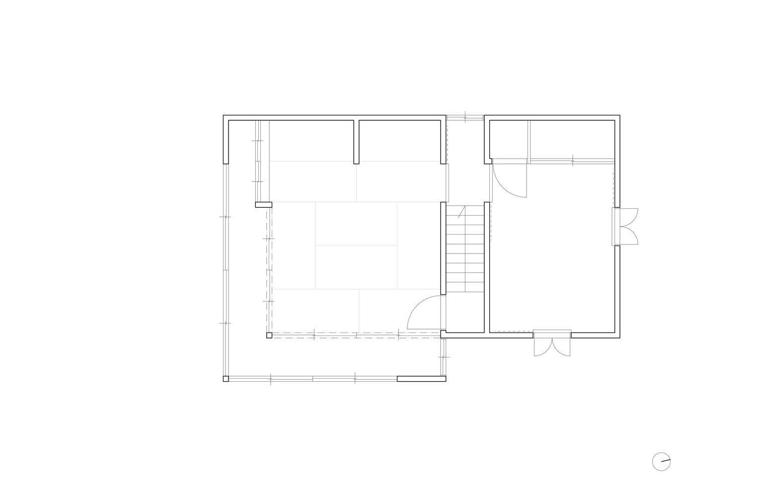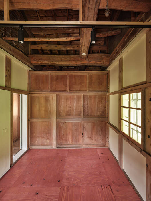 尊重二楼的传统——在二楼,为了保持空间的特色,进行了最小的改动。主房间的榻榻米被翻新,而房间的其他部分基本保持不变。在tokonoma(装饰壁龛)中,安装了一根不锈钢杆,穿过隔墙,创造了一个挂衣服的空间——在保持壁龛存在的同时引入了一种新功能。库拉储藏区也可从二楼进入,用落叶松胶合板地板进行了更新,地板上涂有红色强调EP擦拭涂层。天花板被拆除,露出了原始结构,暴露了建筑的历史层。这两扇传统窗户最初装有铁条,但在中心开了一个开口,稍作修改,既保留了它们的历史意义,又提供了更多的光线和视野。原来的滑动门和百叶窗被重新粉刷过。