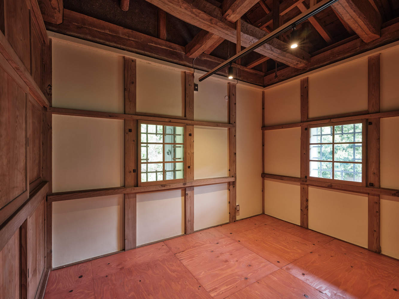 Respecting Tradition on the Second Floor –On the second floor, minimal changes were made to retain the character of the space. The tatami in the main room was refurbished, while the rest of the room was left largely unchanged. In the tokonoma (decorative alcove), a stainless steel pole was installed, cutting through the partition wall to create a space for hanging clothes—introducing a new function while maintaining the alcove's presence. The kura storage area, also accessible from the second floor, was updated with larch plywood flooring finished in a red accent EP wipe-off coating. The ceiling boards were removed to reveal the original structure, exposing the building's layers of history. The two traditional windows, originally fitted with iron bars, were slightly modified by cutting an opening in the center—maintaining their historical significance while allowing more light and views. The original sliding doors and window shutters were repainted.