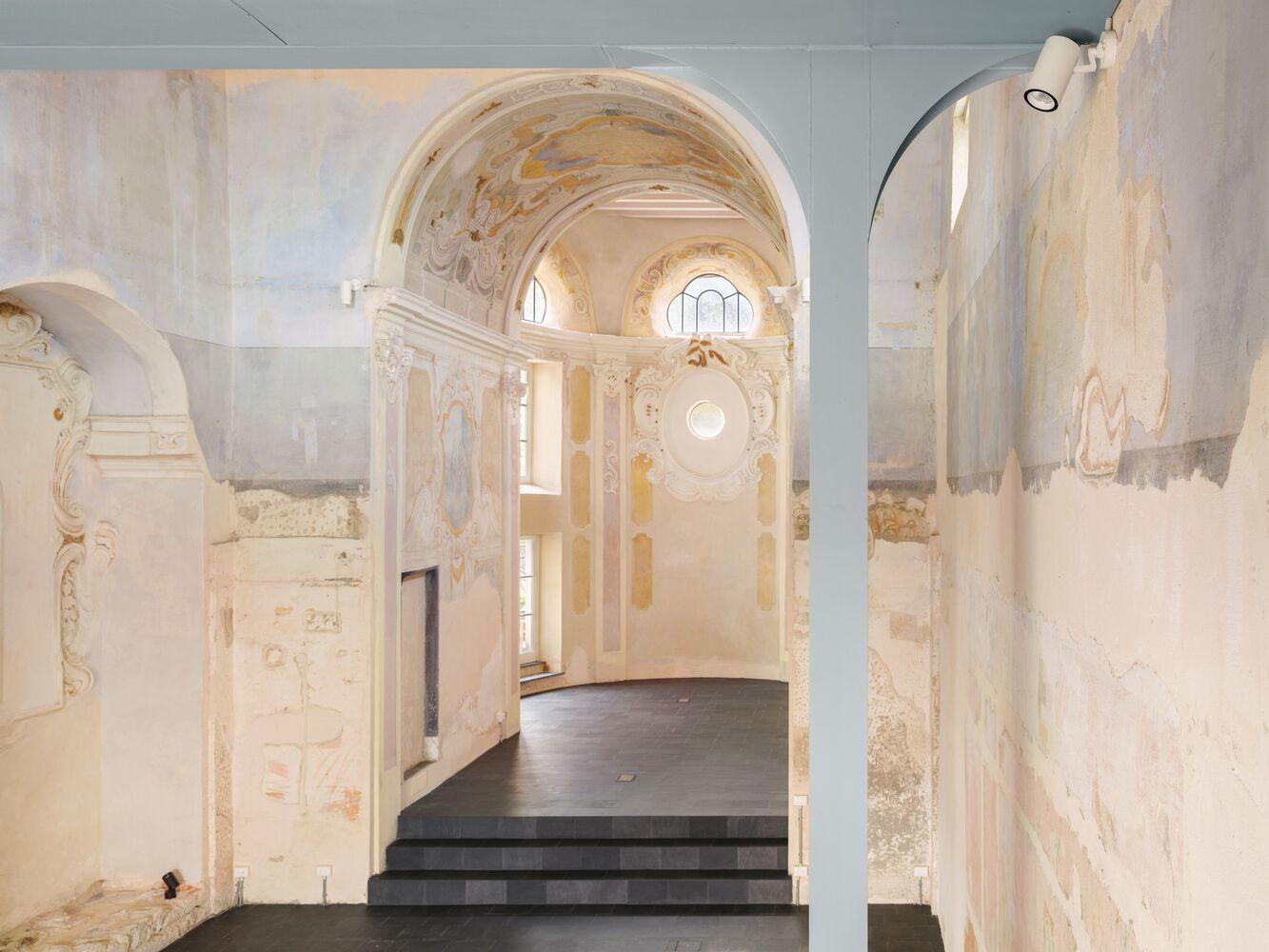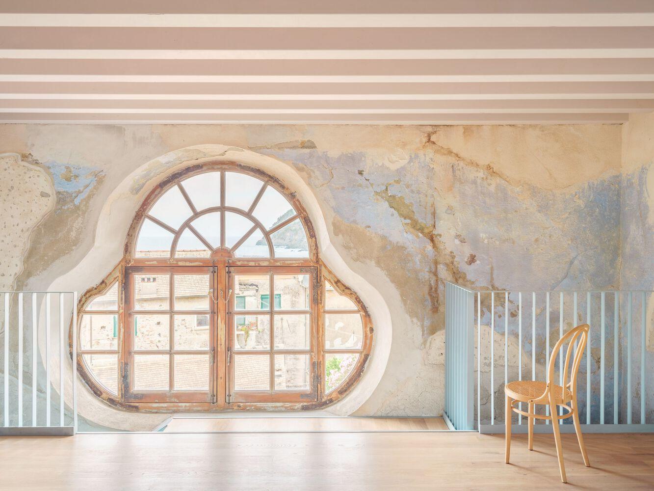 In front of the counter façade, inside two small rooms, there is space for the technical systems. The restoration of the frescoes of the presbytery acts as a counterpoint to the walls of the hall. In this part of the building we wanted to leave the story of twentieth-century events exposed, just consolidating the pastel shades, the covered traces and the missing plasters as an informal expression of recent history. Although less "noble" than the ancient events, it now acquires an aesthetic value as well as a value of memory. The side altars, now stripped of their coverings, were covered with a layer of lime putty that allows us to glimpse their original shape, by now softened over the years. The stucco, cleaned of the patina of the centuries, brought to light traces of the original colors. The floor was made with slate tiles laid in a row and bordered every three. On the mezzanine floor, an open space overlooks the hall below. From the large trefoil window you can look at the village of Levanto up to the sea.
