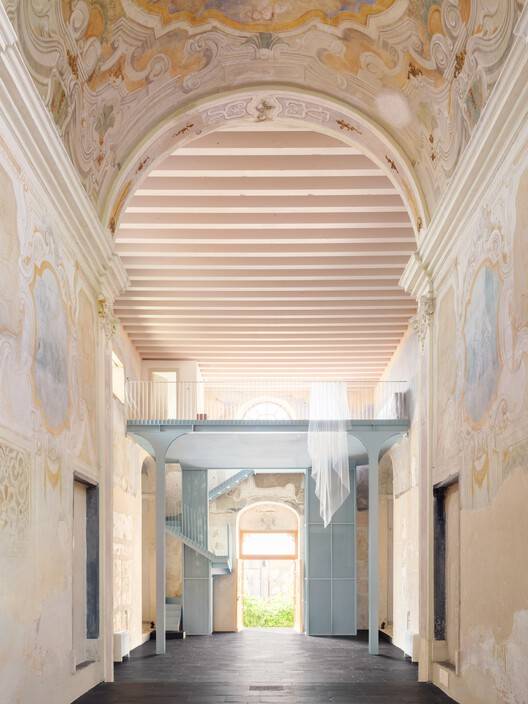 Design - The "cantoria" is a small architecture placed inside the hall. Its terse and linear design remodels the space of the entrance of the church. The only decorative concession is represented by two curved "capitals" that interrupt the linear structure and recall the elegance of the classical architecture. It is a mediating element, it suggests new spatiality and attempts connections with the ancient building. The new exposed steel structure is a spatial machine that adds new glimpses and views, modifying the perception of space. The staircase leading to the mezzanine floor wraps around the structure, offering a close-up view of the eighteenth-century stuccoes.