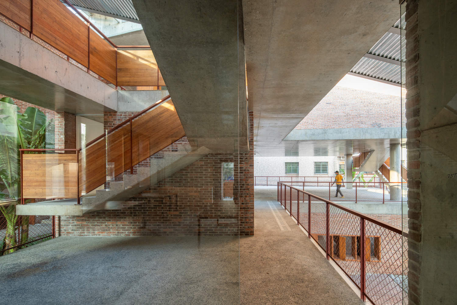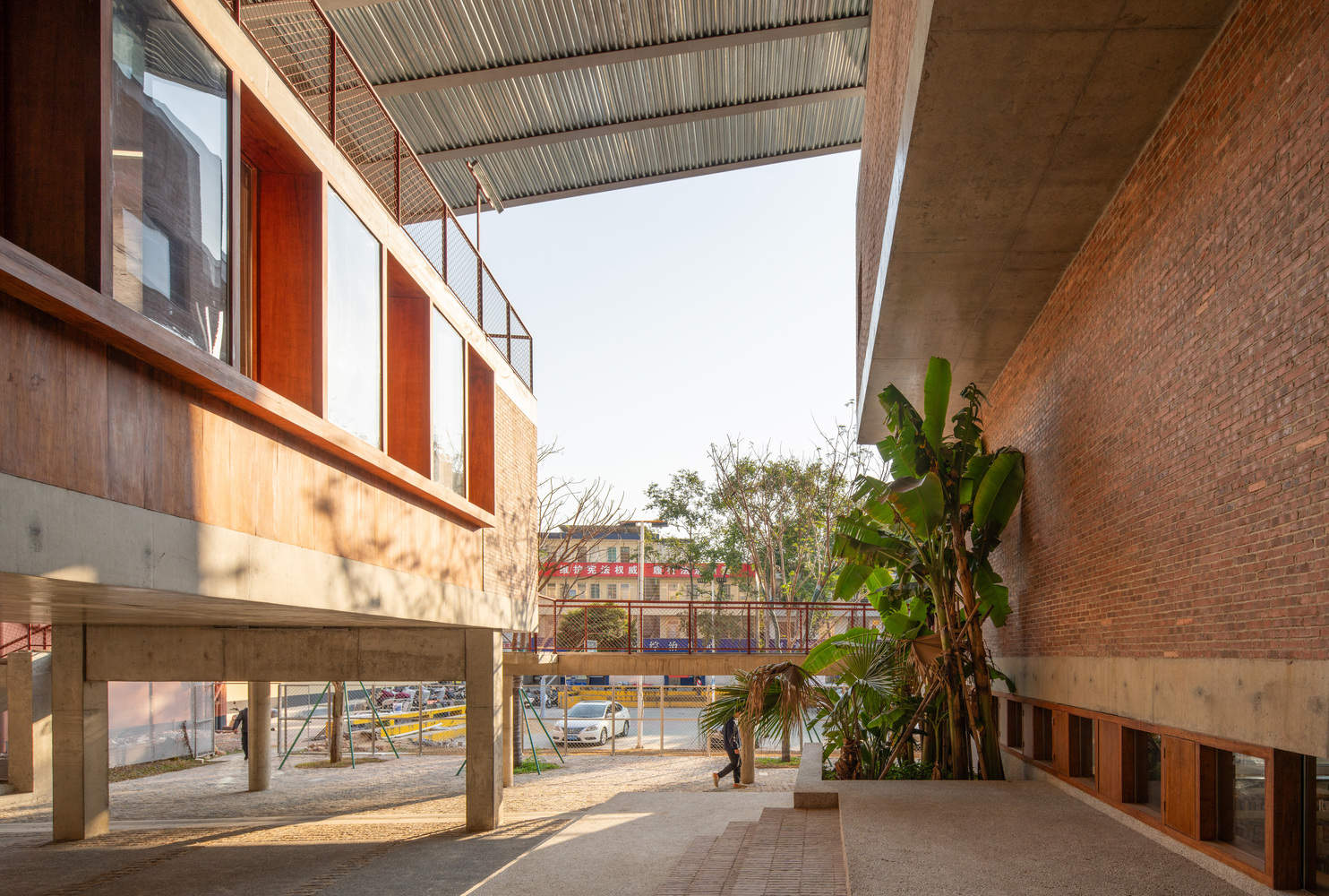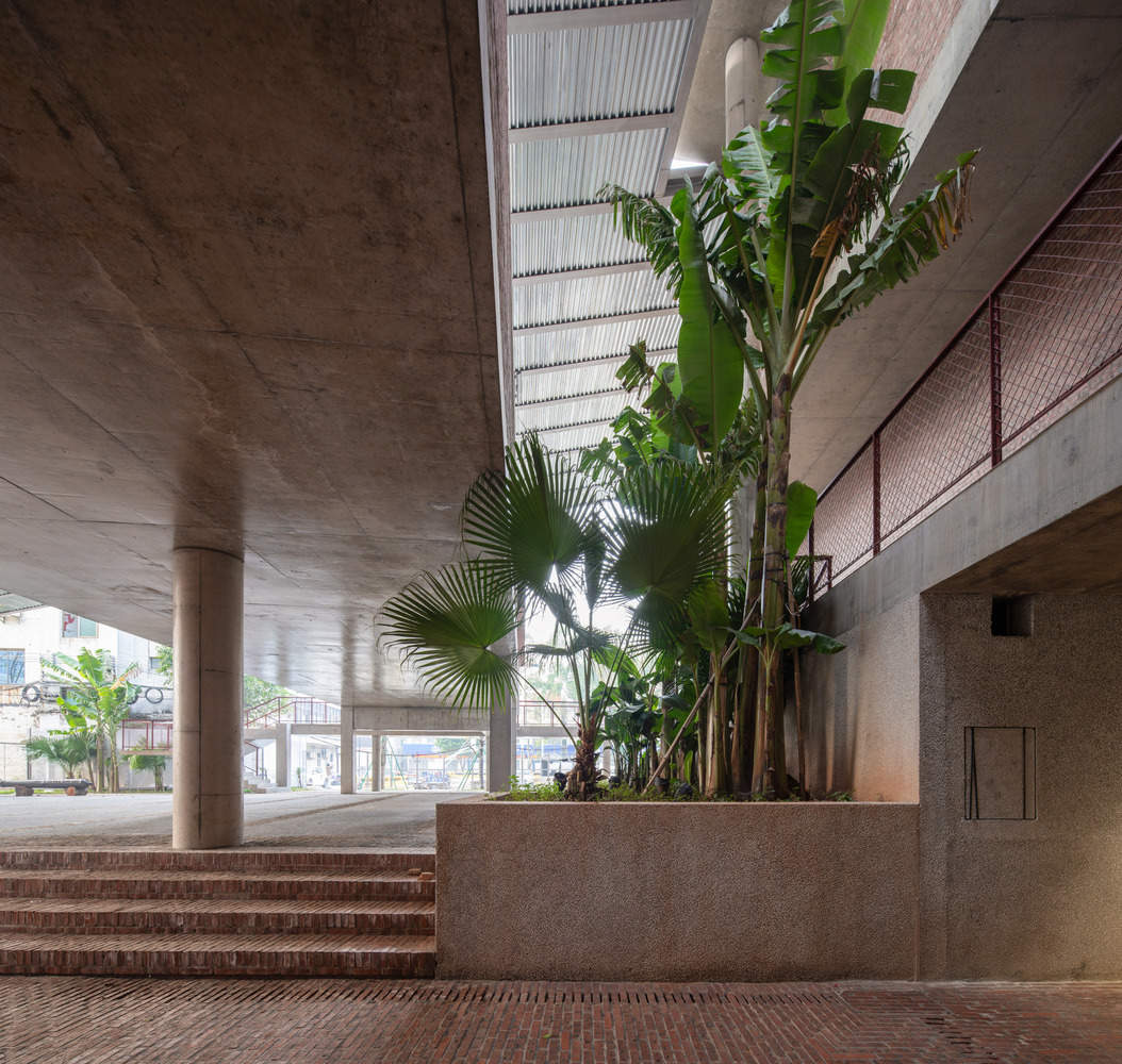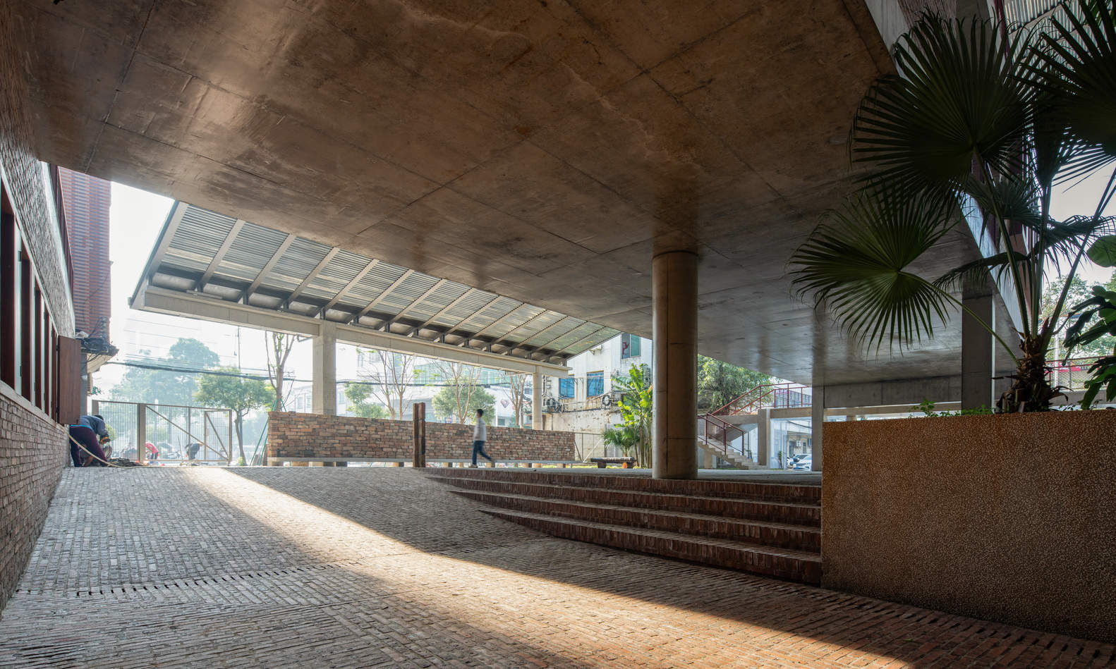 To maintain harmony with the local environment, the construction employs familiar materials such as red brick, washed terrazzo, tiles, and galvanized steel plates. Economic considerations are integral to the project: the profiled galvanized steel plates used in the ceiling also serve as the roofing surface, reducing scaffolding costs, while the bluestone slate tiles come from leftover materials from landscaping projects. These "low-tech" construction methods not only preserve the texture of traditional dwellings but also enhance the public character of contemporary rural life.
